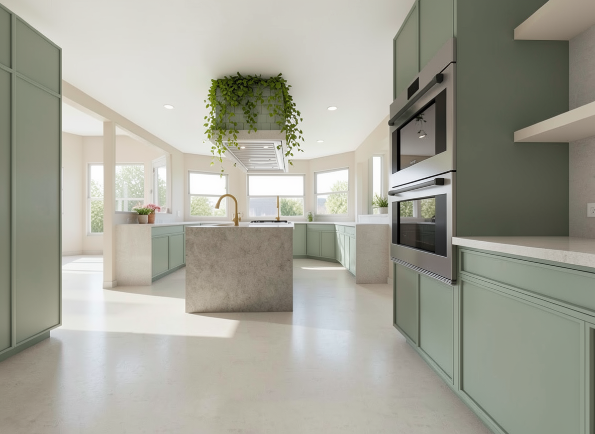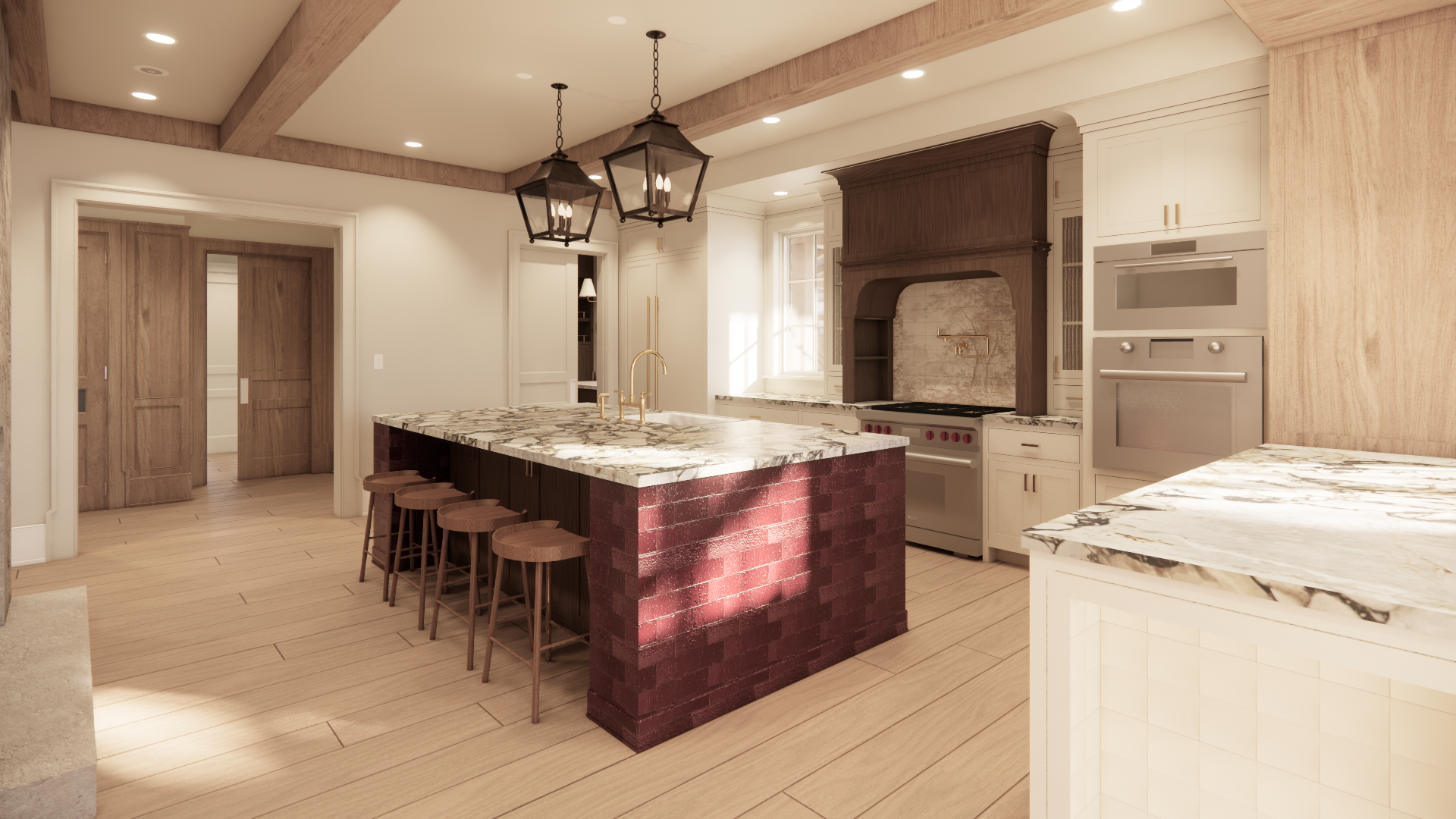 create a photorealistic rendering of this kitchen do not add remove or modify any architectural elements do not add any decor objects or styling do not reinterpret or redesign any materials strictly preserve all geometry layouts and surface applications exactly as shown this is a material and lighting enhancement only critical tile millwork accuracy do not alter or simplify all materials must remain distinct and true to their specific finish do not blend substitute mute or reinterpret any surfaces material specifications must be followed exactly millwork benjamin moore pale oak warm off white with soft taupe undertones smooth painted finish with subtle natural light reflection island tile only waterworks grove twenty field tile size 3 5 8 x 7 5 8 color plum deep plum tone with slight tonal variation ceramic finish with gentle sheen not high gloss maintain tile size layout and grout lines exactly range wall tile only high priority cream ceramic tile base with a hand painted forest mural mural features organic forest imagery in a brownish red tone brushstroke texture artisanal variation and painterly detail must remain visible do not simplify into a solid color or generic pattern do not blur repeat or symmetrize the mural preserve the irregular handcrafted quality and unique composition countertops viola monet marble dramatic veining with movement in burgundy plum cream and gray tones high polish with realistic depth reflectivity and natural variation lighting preserve all existing fixture designs exactly as shown enhance lighting only for realism warm natural illumination with accurate shadowing and soft falloff ensure light interacts correctly with glossy vs matte surfaces rendering rules do not change scale proportion or placement of any materials do not alter tile layout grout or orientation do not reduce variation in natural stone or hand painted surfaces do not over saturate or artificially stylize colors goal achieve a high end editorial quality photograph look with precise material clarity especially maintaining the integrity of the hand painted mural tile and the richness of the viola monet marble