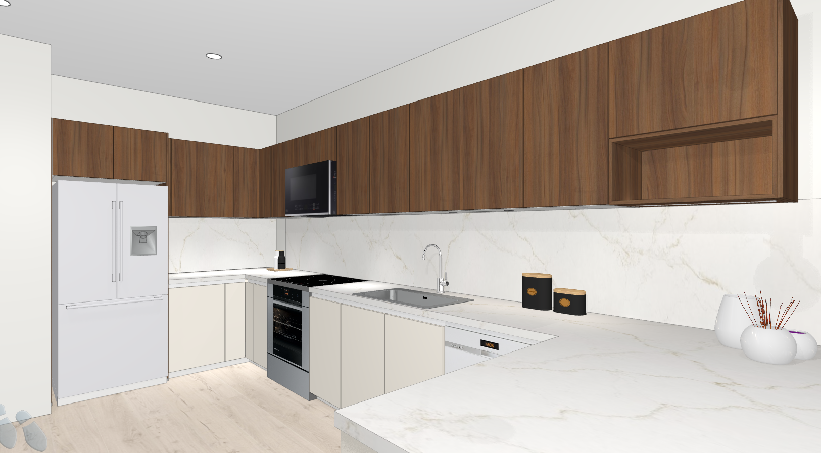 elegant kitchen dark walnut mat wall units and magnolia gloss fridge white
