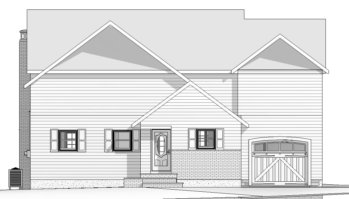 render a charming two story house with a steep gabled roof in a suburban setting the walls are a soft inviting light gray with white trim accents the brickwork foundation and chimney are a warm earthy red brown the garage door features rustic wooden planks in a natural oak finish windows have classic black shutters and a detailed front door painted a calming seafoam green surround the house with a lush green lawn and a clear blue sky creating a serene welcoming atmosphere
