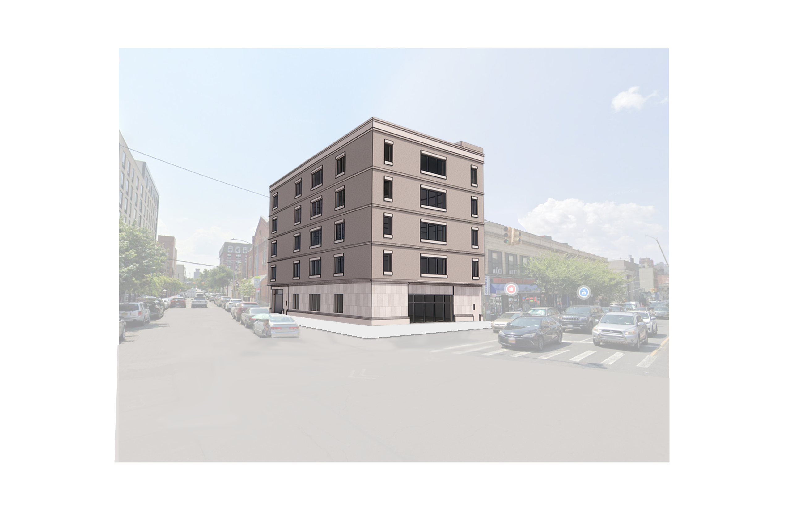 a modern four story urban building on a bustling city street the building has a grey brick facade with large black framed windows and light concrete panel at the ground floor the street is lively with parked cars and a hint of greenery from trees lining the sidewalks the sky is a bright blue with a few fluffy white clouds suggesting a clear sunny day the atmosphere is vibrant and energetic capturing the essence of a busy city scene architecture
