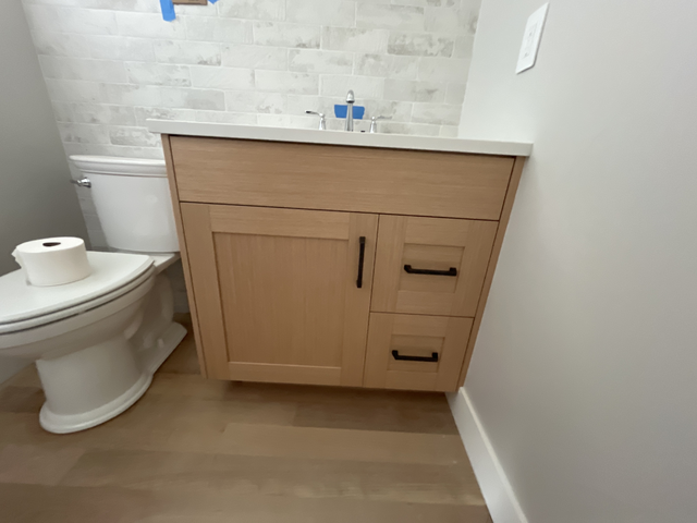do not change the cabinets in any way preserve the exact cabinet colors materials finishes dimensions door and drawer styles hardware spacing alignment and all geometry exactly as shown do not alter the countertop shape backsplash appliances flooring lighting fixtures or wall structure only remove the construction materials clutter and mess from the scene clean the room and make it look finished and staged add a few simple tasteful home accessories appropriate for the style of the space but do not add or remove any furniture windows or architectural elements maintain the original lighting direction and realism enhance clarity and polish the photo while keeping the cabinetry and room design completely unchanged do not alter the lighting to keep the cabinet colors as they are in the image stage with modern bath accessories and a mirror above the sink