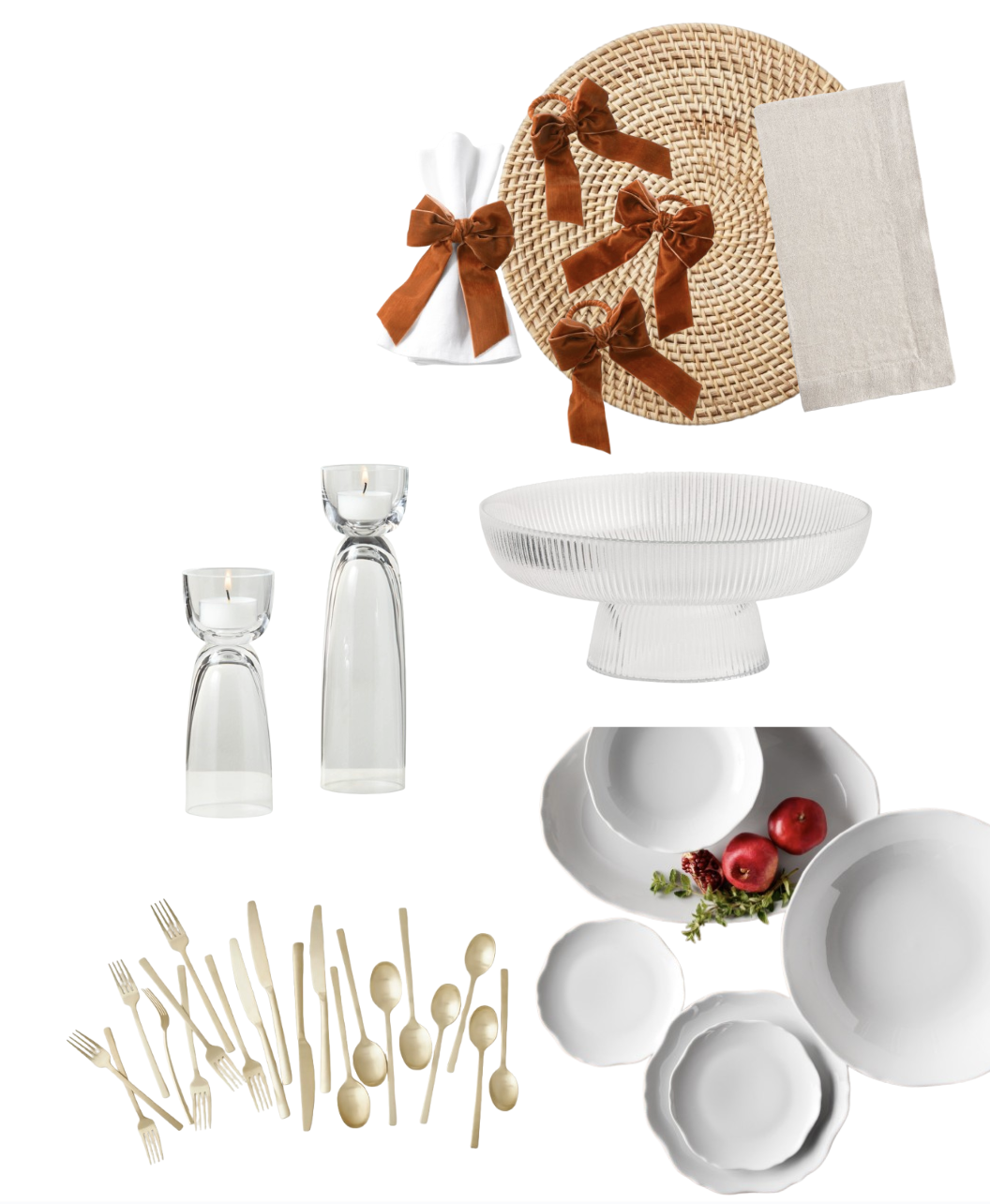 use the items in the image to set a large autumn table scape in a modern contemporary there is a natural woven charger in the upper right the dishes are on the lower right which are scalloped the candle holders and bowl are both glass the view should be from the head of the table looking over the set table