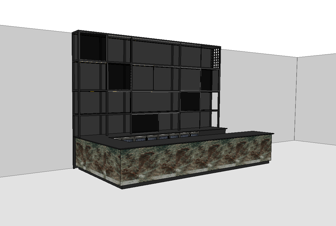 interior shot enhance the realism and overall quality of the image do not change the design shapes layout or composition in any way keep all existing geometry exactly the same make all textures more realistic and high quality improve the environment and lighting to look as photorealistic as possible with well balanced natural illumination the black area at the back is black glass and must have accurate realistic reflections add led lighting under the shelves with soft realistic glow place realistic drinks and bottles on the shelves with correct materials labels and reflections decorative elements should remain gold with realistic metallic reflections and proper light response focus only on enhancing realism lighting materials reflections and image quality do not alter colors proportions or design elements only improve photorealism and rendering quality architecture