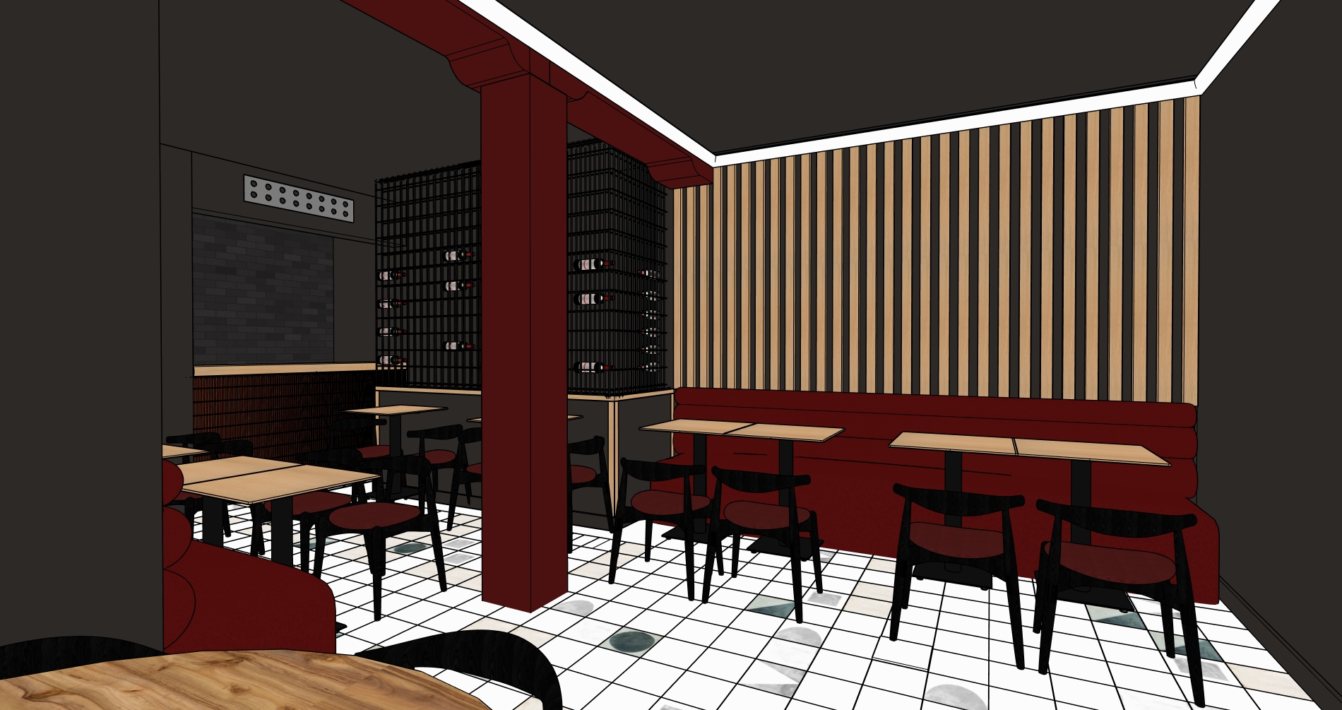 crea una imagen fotorealista en base a esta de sketchup realza las texturas manten la escena oscura