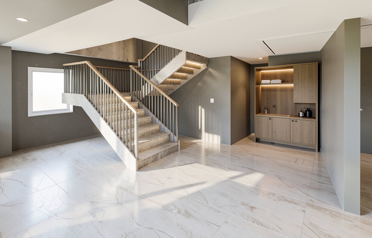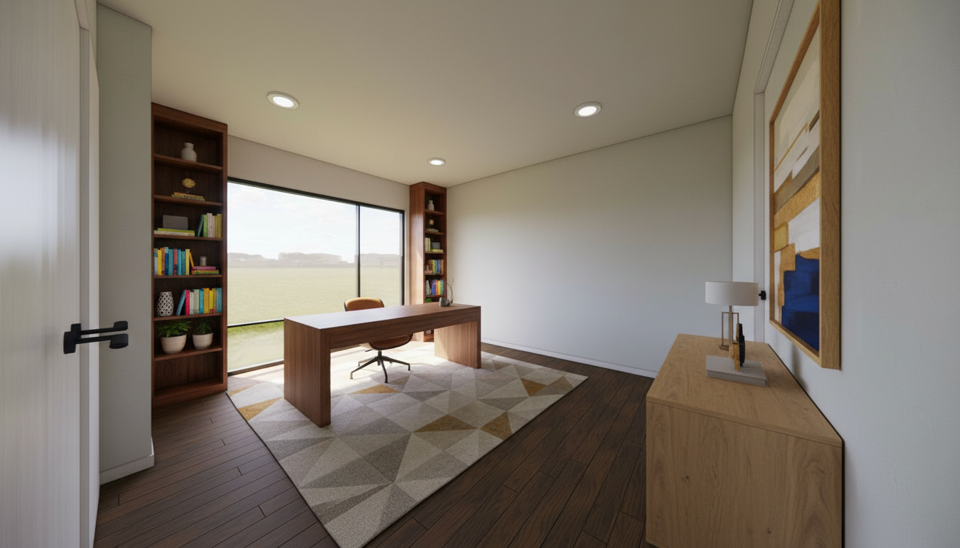 realistic image luxury bathroom tall cabinet between vanities hang mirrors in front of vboth windows hang light over tub show water in tub lush white fluffy rug on floor in front of tub turn on interior lights small mosaic glass tile on wall behind tub make tile light colored and go to ceiling only 1 light centered on tub make window frames white remove backsplashes more luxurious cabinetry correct rug shape remove window behind tub add hanging light over tub remove mirror on angled wall only one pendant light over tub remove counter backsplash only remove marble wall behind vanities only remove mirror make light fixtures match remove window in tub area correct rug shape to oval andd water in the tub make cabinets white with more detail and furniture legs add mirror to front of tall cabinet add window shades to windows remove window at tub remove side window on left put shades on both windows