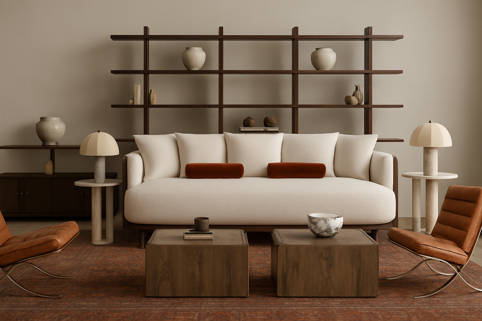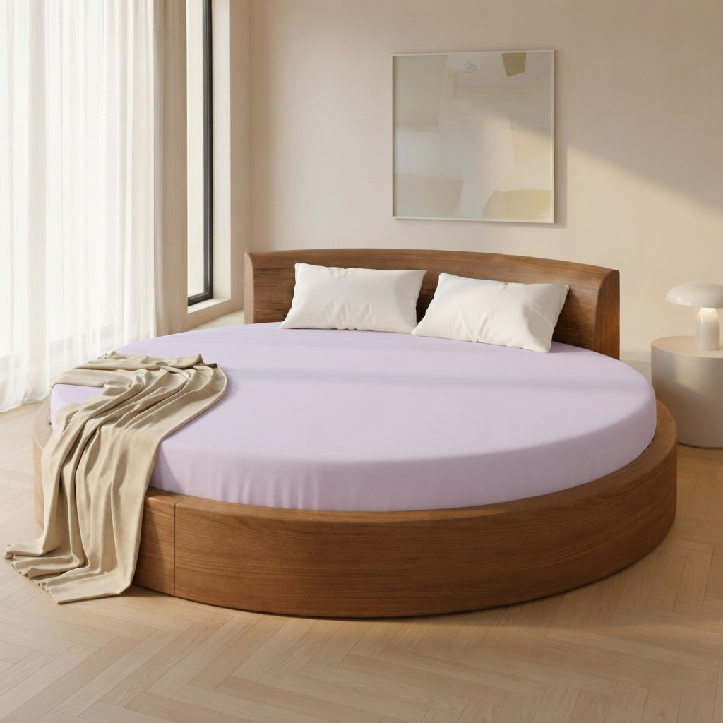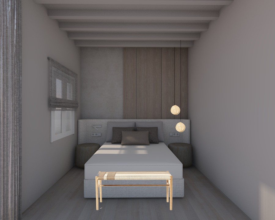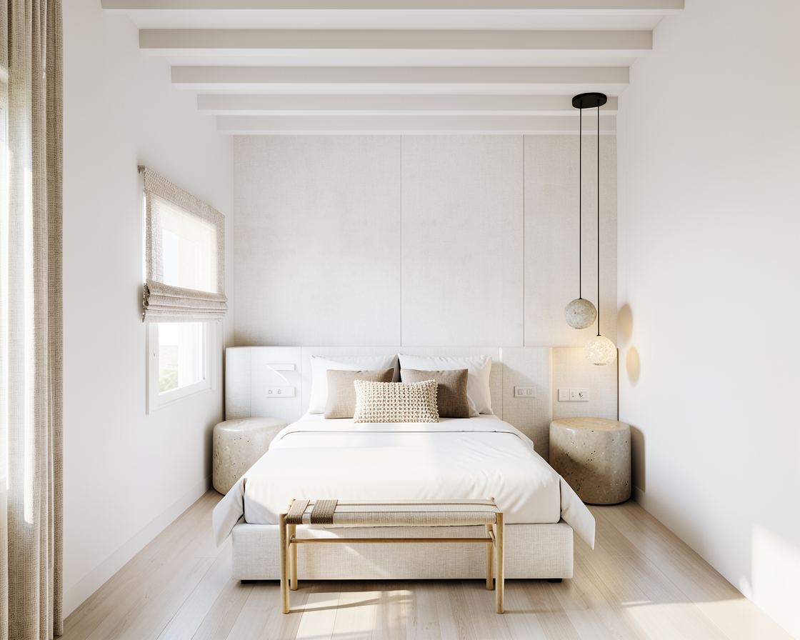 realistic render the headboard is upholstered in a white beige linen fabric creating a soft and elegant focal point the bed is dressed with perfectly ironed impeccably arranged bedding and pillows styled like in a five star hotel the sheets and duvet are crisp smooth and completely wrinkle free the two back pillows are in an off white tone the middle pillows are in a taupe beige texture while the front decorative pillow features a beige boucl fabric adding texture and depth through layered styling create a highly realistic render of a fresh and natural interior room with a calm uplifting atmosphere the bedside tables have a polished cement texture in a beige tone the pendant lights on the right are flat round pendants with a stone effect texture and the light has effect from down wood panel from the right in a light oak wood