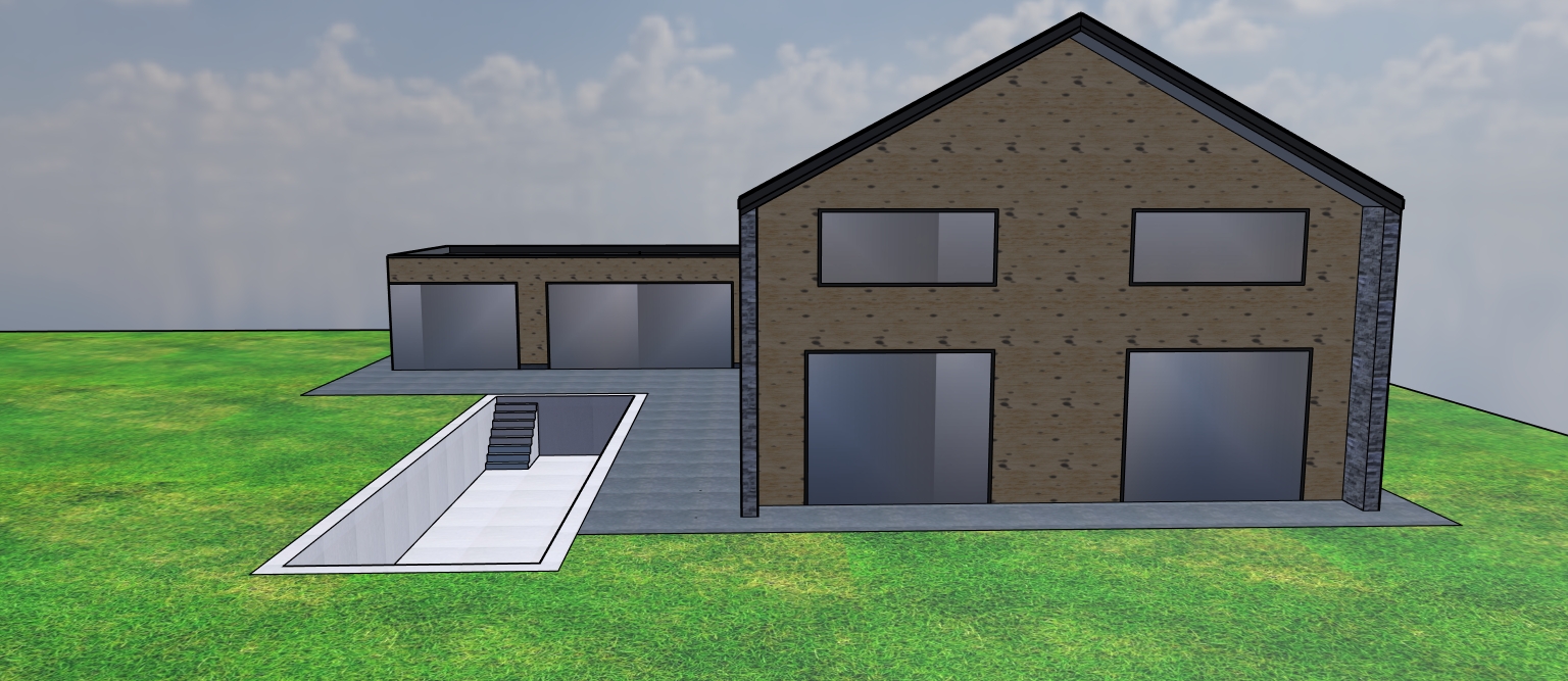 green woods low mountain soft grey stone wall a carport black golfed roof lawn around the house pool