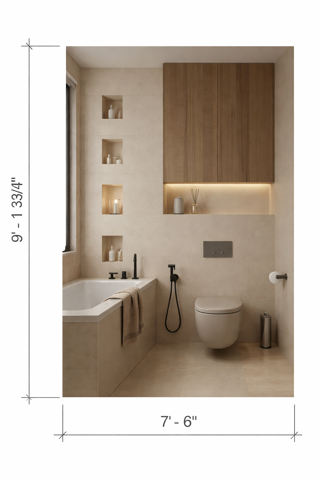 modern design concept with warm stone tile floor mounted toilet with shower unit and tub filler