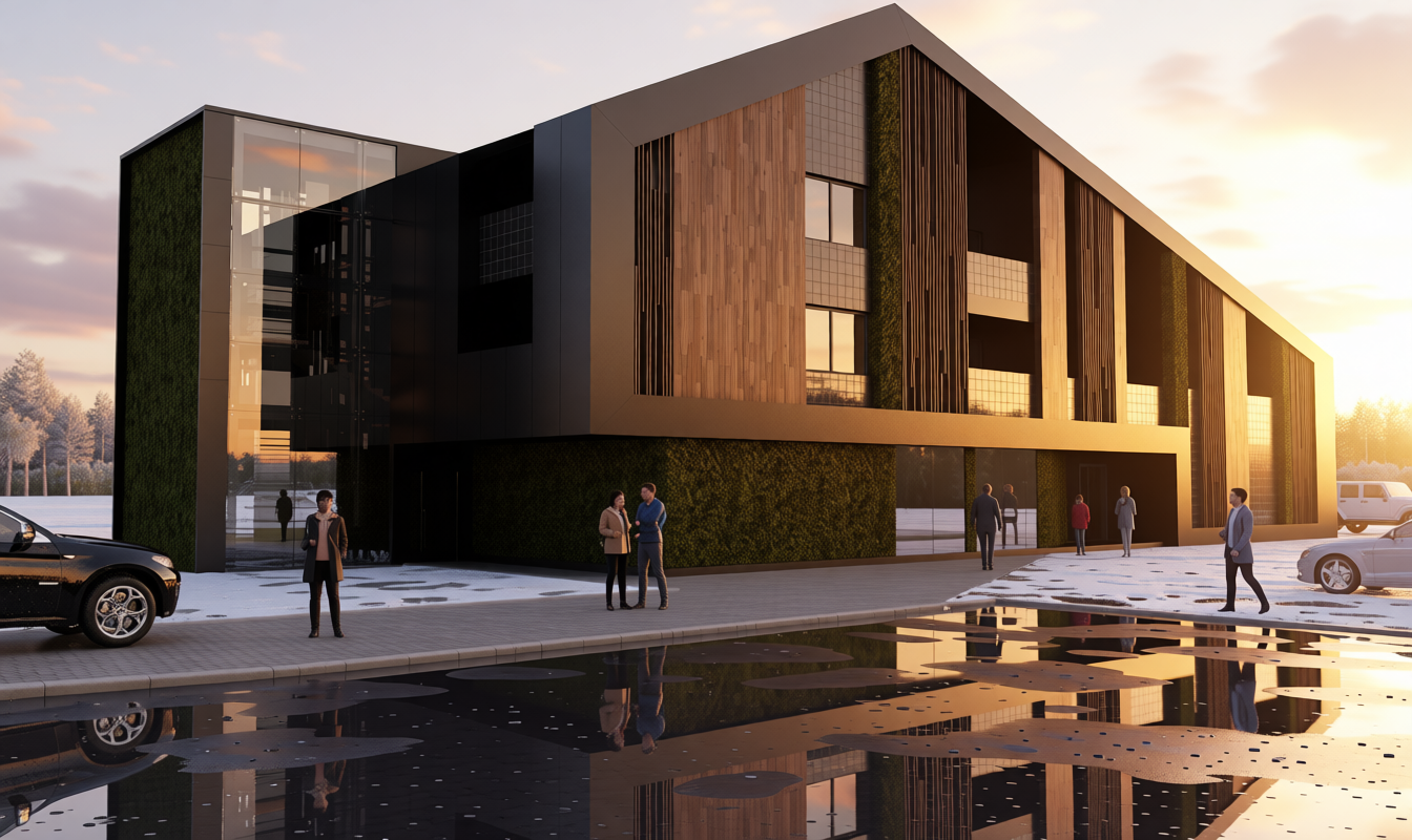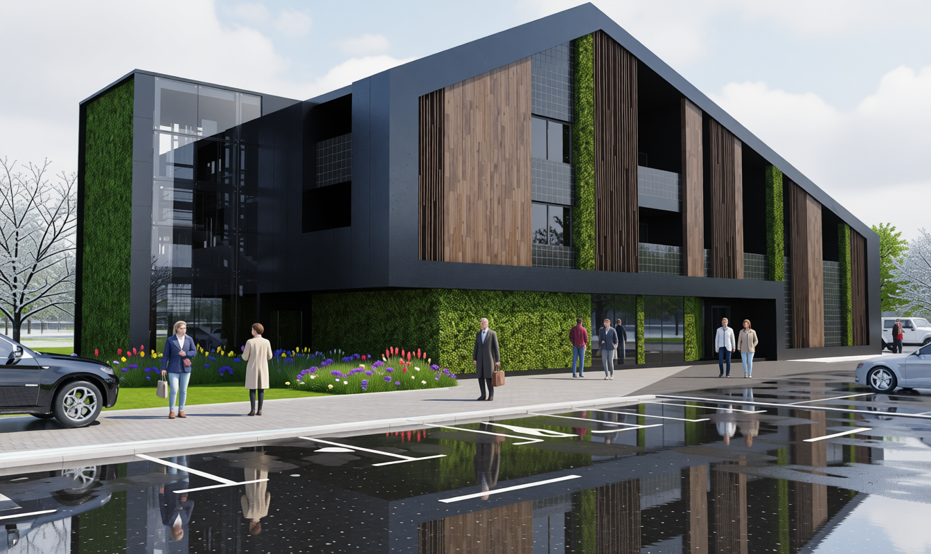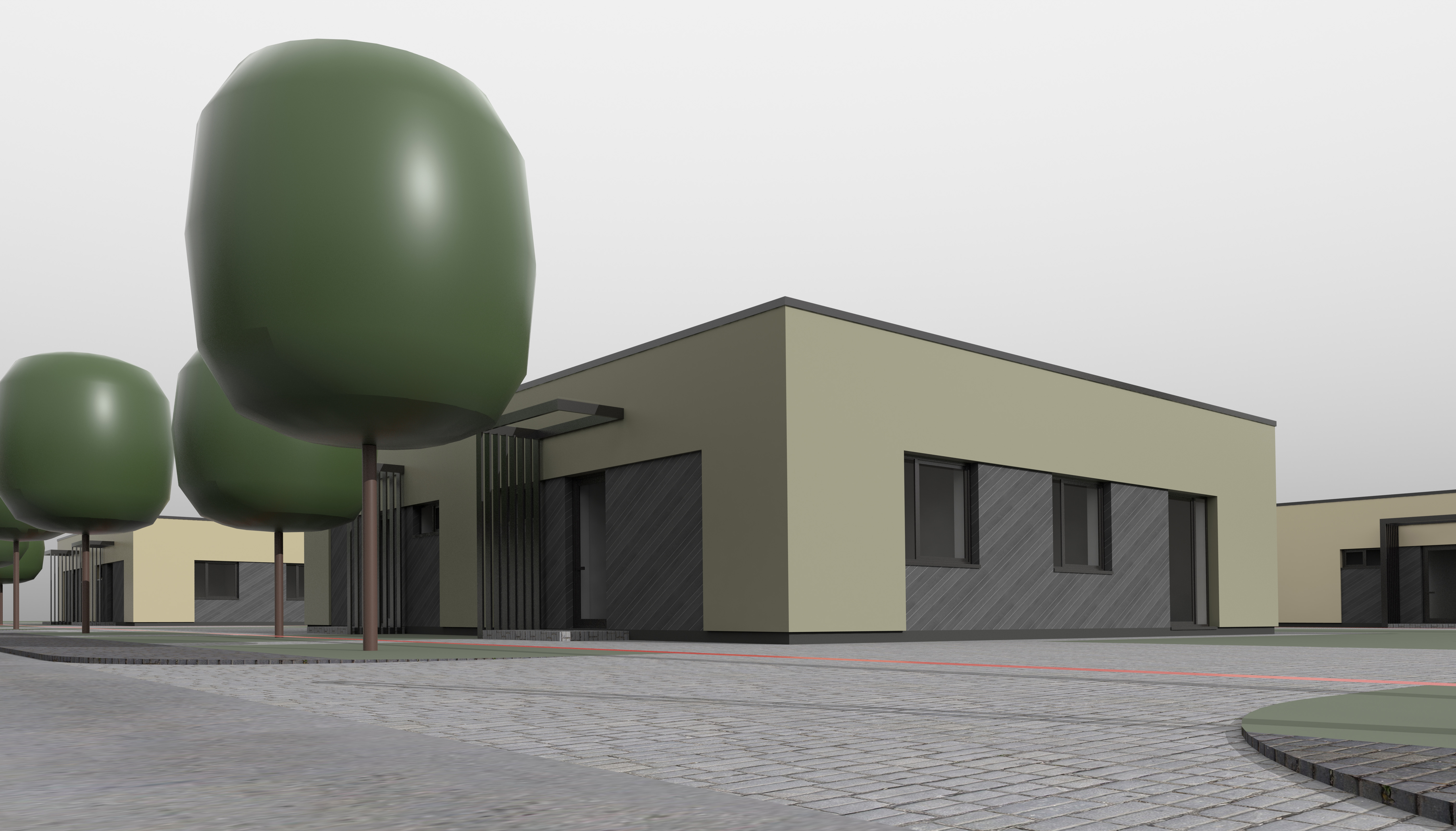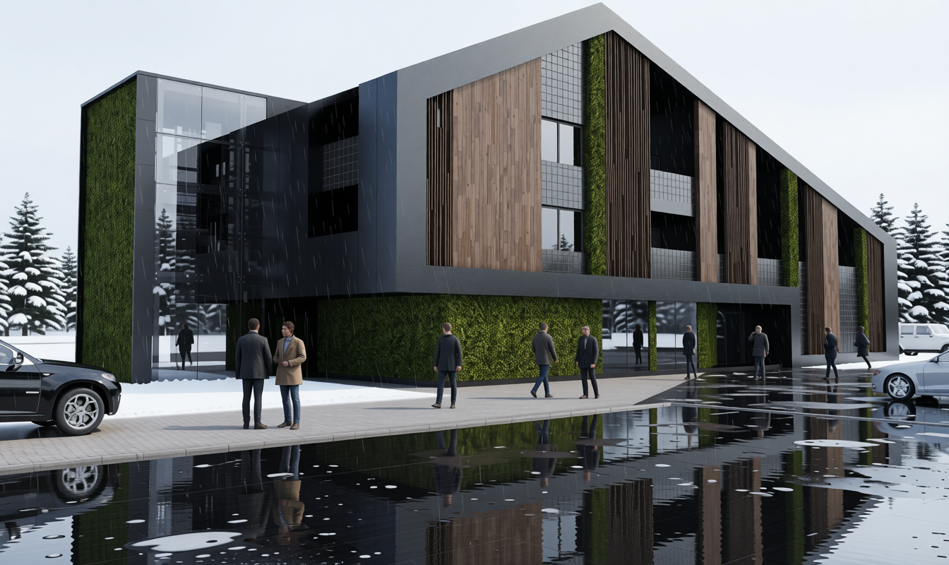 minimalist modern architecture single story building with clean lines and large windows soft olive green and yellow green facades matte dark grey accents 45 degrees grey wood planks concrete pavers asphalt road scots pine trees with deep green foliage and brown trunks cloudy day sky creating a calm and serene atmosphere soft diffused lighting enhancing the minimalist aesthetic change red lines to dark grey metal wire fence with sliding fence gates where the entry to the site is add 1 car near building