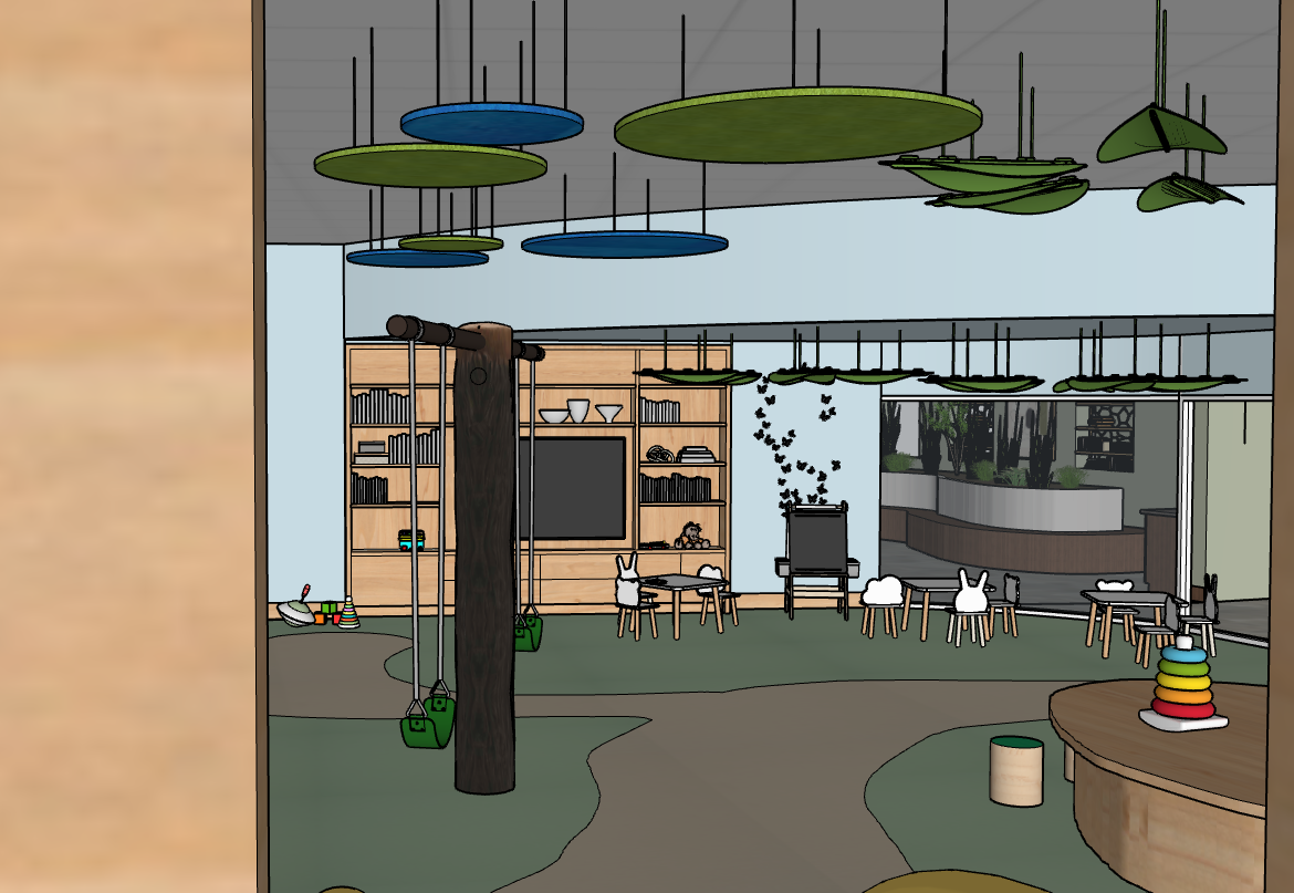 create a photorealistic rendering of this indoor childrens play space the light from the windows would be giving mid day easterly sun make the ambience slightly warm and recessed lights to the ceiling do not lose the colours of the materials do not add more furniture