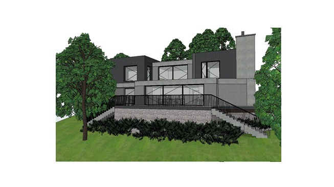 create a photo realistc visual of this architects image make the trees look real the black parts of the building are modern vertical timber cladding and the rest is poured concrete add classy planting with wild flowers