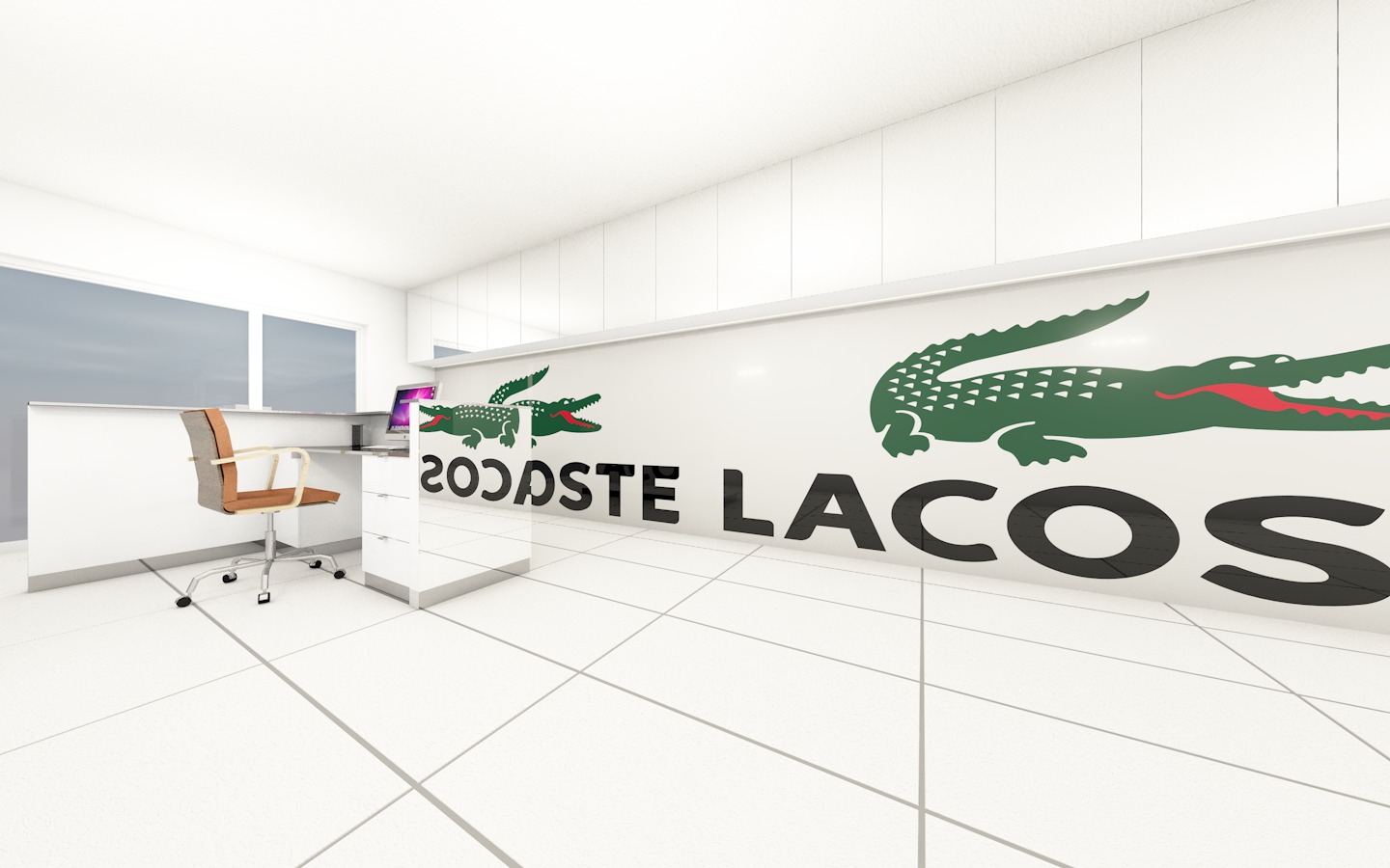modern lacoste store interior with wall mounted mirrored cabinets and a sleek stainless steel inox reception desk neutral colors with green accents bright airy lighting with soft spotlights photorealistic high detail render
