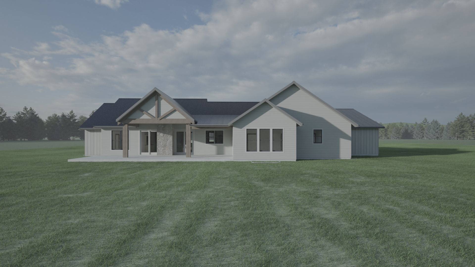 enhance the textures of the architectural design without altering the shape or details of the house including the concrete patio focus on improving surface details lighting and shadows for a realistic representation ensure that the lap siding and board and batten are preserved in their original configuration and that all elements remain unchanged