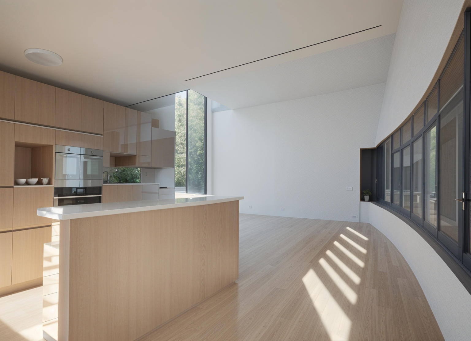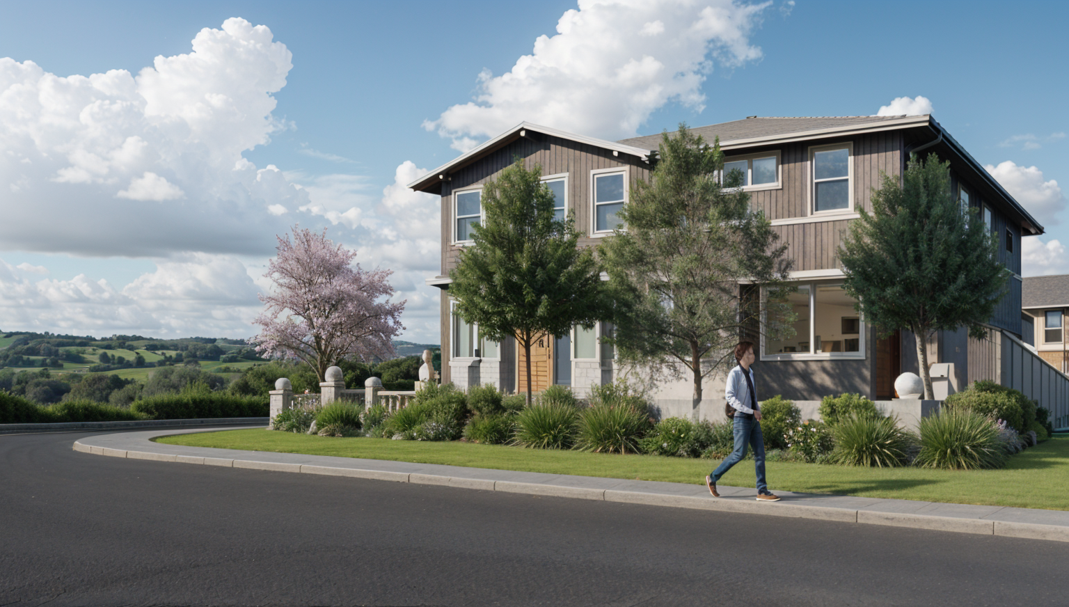 enhance the scene with have photorealistic materials and keeping the original colors the atmosphere should be serene and inviting with a bright blue sky filled with soft fluffy clouds add low lying landscape native shrubs in green areas