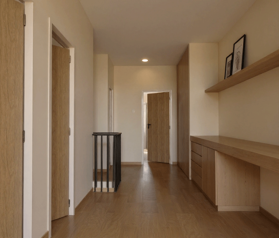 image edit only prompt archsynth use the uploaded image as a fixed base image this is a color edit only not a redesign and not a re render allowed changes only these change the doors to exactly the same color as the walls change the baseboards z calos to exactly the same color as the walls the doors and baseboards must visually blend with the walls creating a uniform monochromatic appearance forbidden changes critical do not change door material texture grain shape thickness or position do not change wall color do not change flooring furniture railings staircase opening or any wood elements do not change lighting shadows exposure or contrast do not change camera angle geometry or layout do not add or remove any objects if an element is not explicitly listed under allowed changes it must remain pixel identical to the original image
