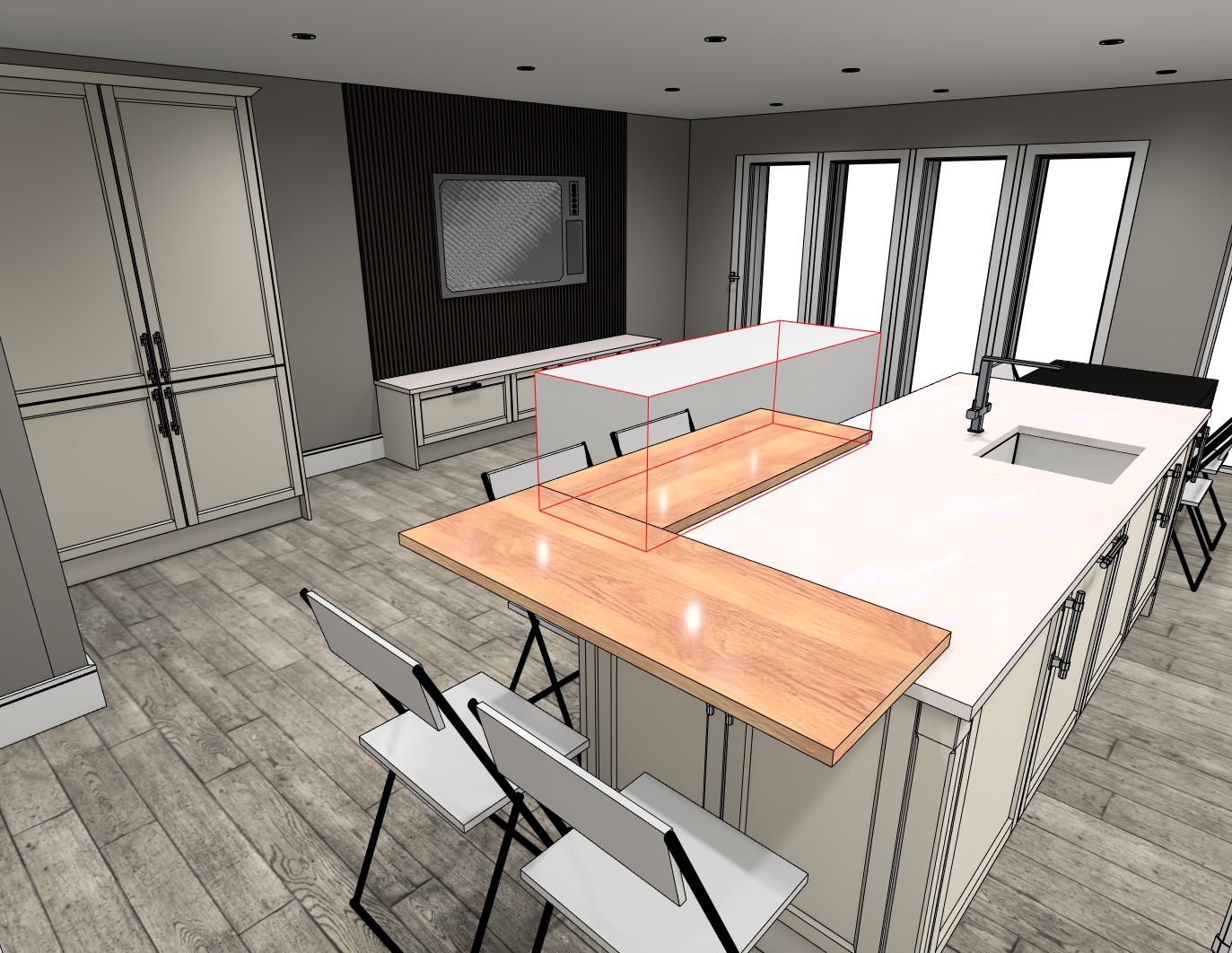 can you alter the stools around the breakfast bar to beige stools with curved back metal and chairs the same add a few accesories onto worktops and items on shelves the square white box should be a grey sofa facing the tv dont add anything else into the room