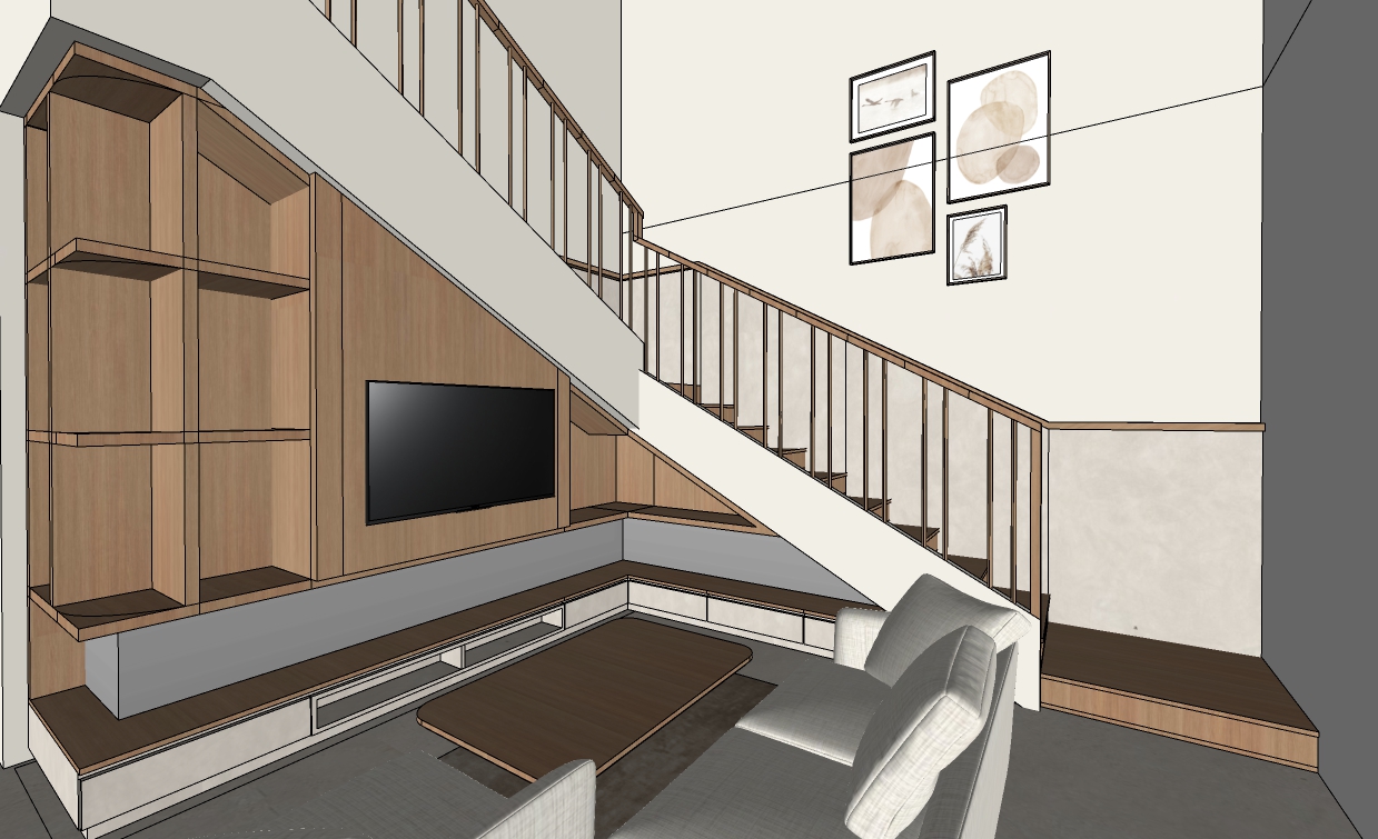 create an ultra realistic image from this jpg add ceiling spot lights use soft light wood textured to the floor and use warm off white for walls and the ceiling is white and add indirect light to the shelves add some decoration and add indirect light to the wood ceiling panel add soft outdoor light the wardrobe door using cream color panel abu abu di bawah tv adalah cermin