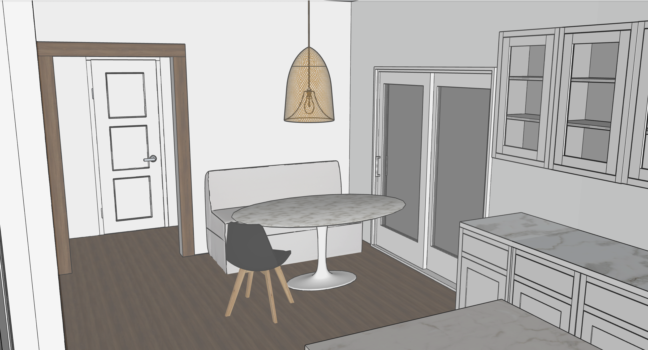 add forest outside door add fruit painting above bench change bench fabric to schumacher floral pattern