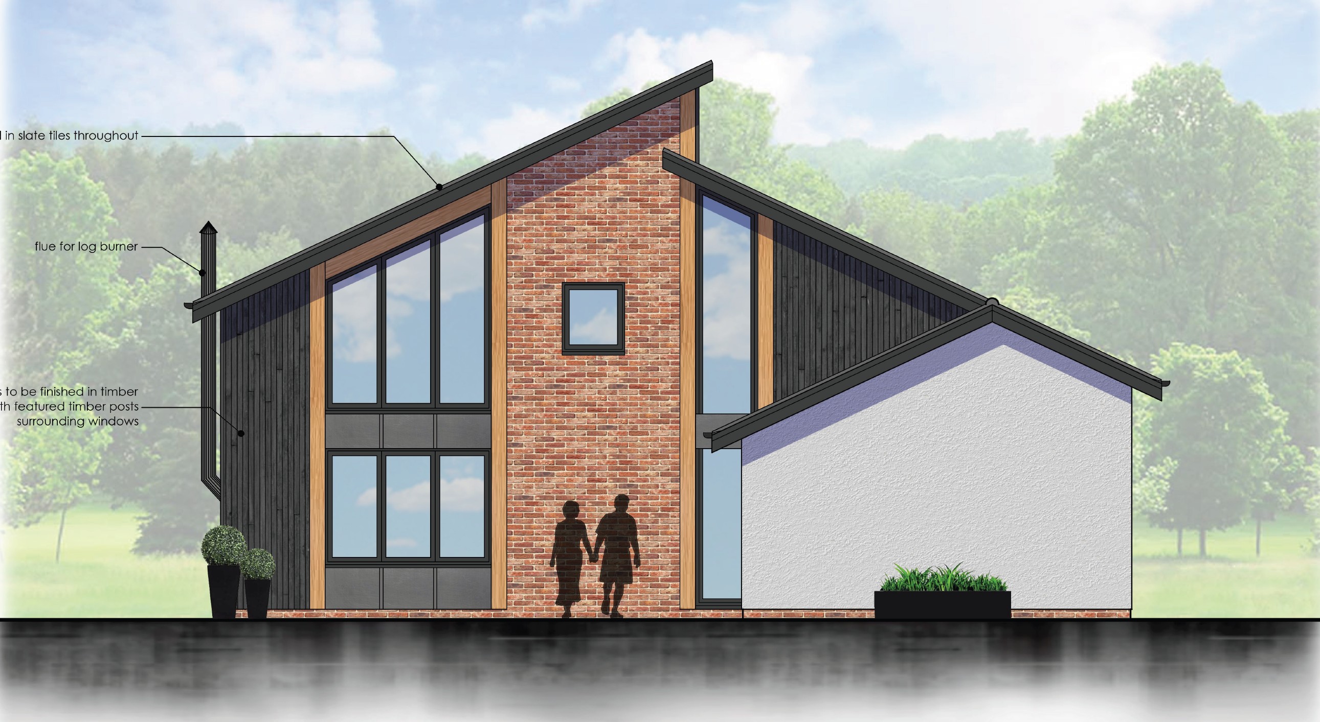modern materials as shown set in woodland show some cars planting and people