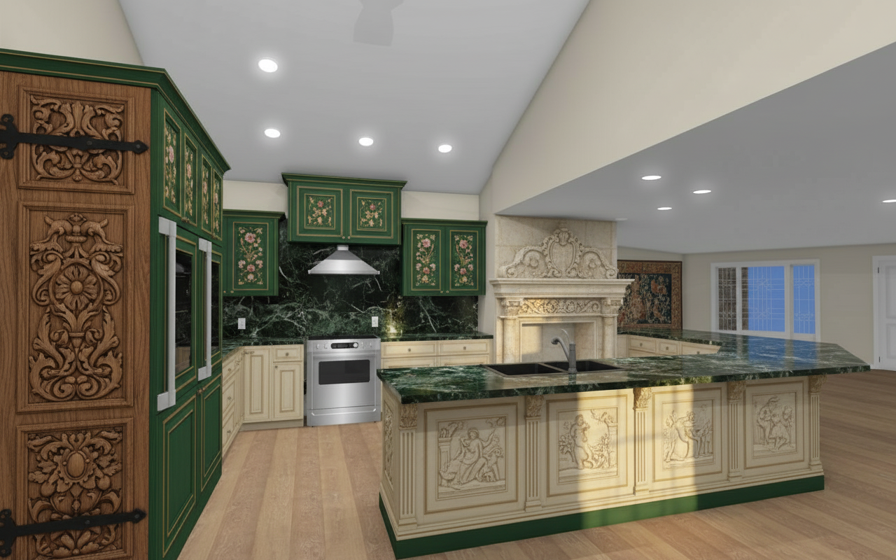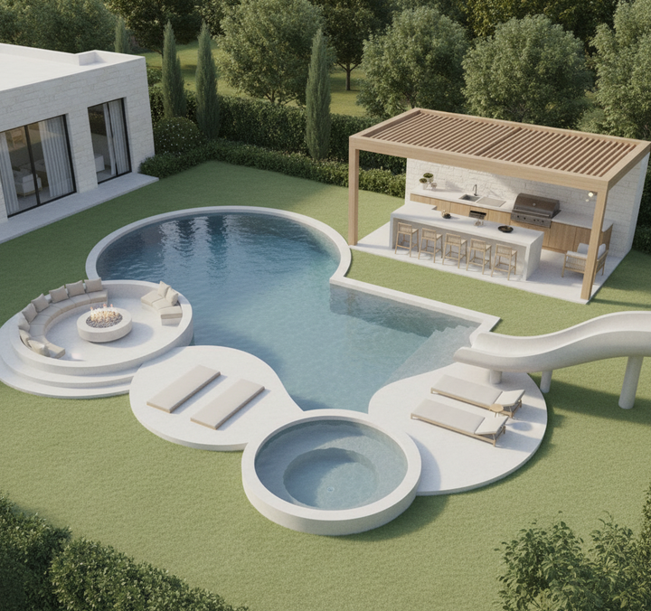 remove the house on the left and move the slide to the top left side do a water feature design around the slide and cancel the pool extension around the slide lowe the 2 bajas to be in the water but keep the shape