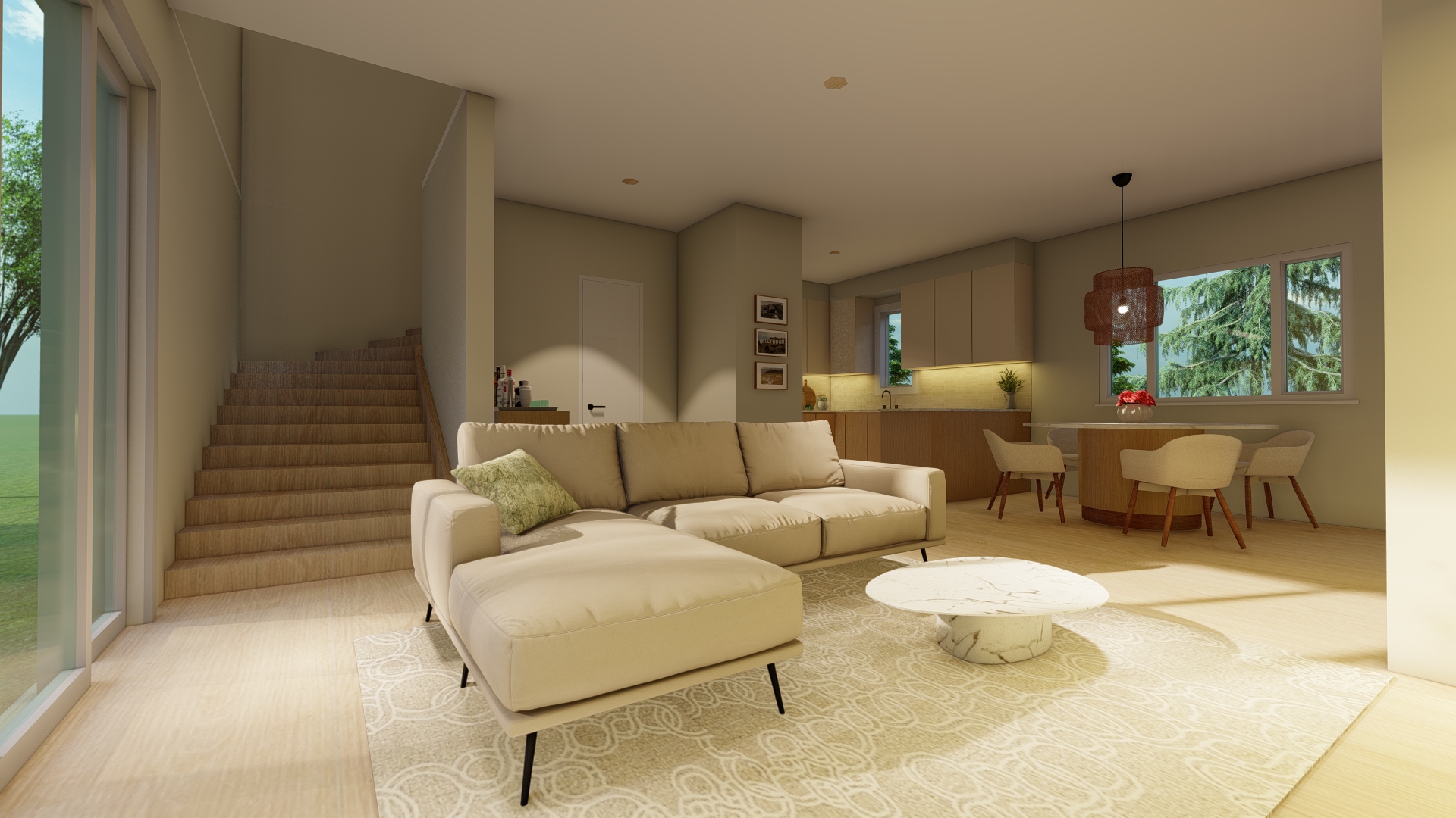 without changing the original layout or spatial configuration use a soft neutral palette with light wood tones beige cabinetry and textured beige surfaces maintain clean lines modern minimalism and organic materials incorporate subtle decorative elements such as ceramic vases natural branches wooden stools and simple countertop styling preserve the lighting direction and balance enhancing diffused light with gentle shadows to create a cozy elegant and realistic atmosphere emphasize natural textures soft contrast and a harmonious serene composition while keeping the layout exactly as in the original image