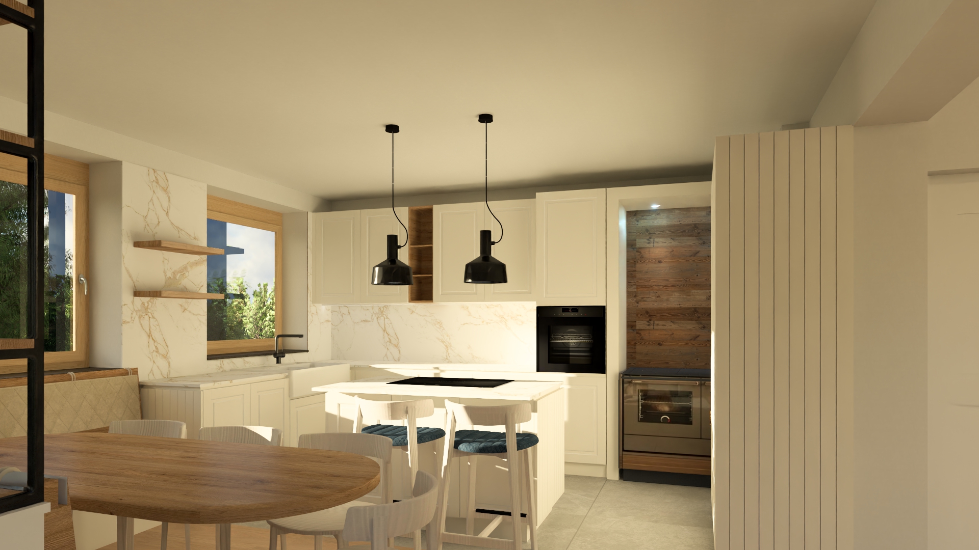 f ge nat rliches licht ein und lass es realistisch aussehen f ge auf den esstisch ein paar tischsets ein und etwas dekoration in der k che belasse alle oberfl chen und farben wie sie sind lass sie nur realistischer wirken die aussenansicht ist aus dem 2 stock mit wohnhaus und einfamilienh user drau en zwischen den gr nen b umen