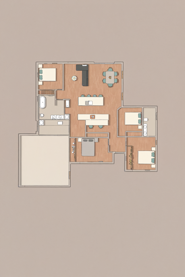 convert this floor plan into a realistic isometric 3d view of a full house show the space from an elevated angle with furniture walls and details visible modern style light colours lansdcape use the same furniture as shows on the plan do not change the orientation of the floorplan