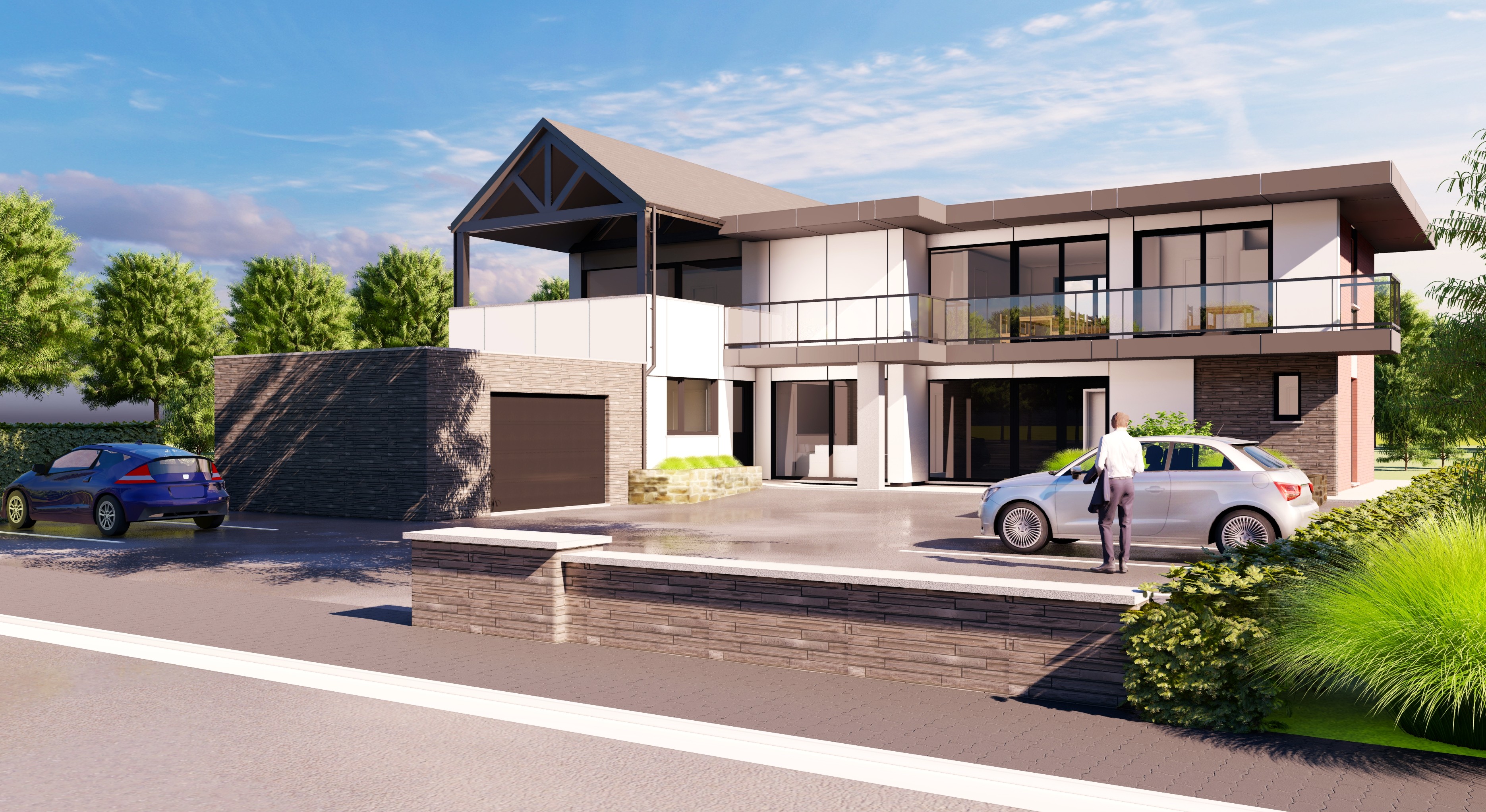 create a high quality photorealistic architectural rendering based on the provided reference image preserving the original architectural design volumes proportions material palette textures and color scheme as shown in the reference image maintain the existing roadway and sidewalk in the foreground exactly as in the reference image including their alignment materials and urban character enhance and refine the existing vegetation with carefully composed planting mature trees layered shrubs ornamental grasses and ground cover improving depth and atmosphere while keeping the architecture visually dominant include a limited number of human figures and a few context appropriate vehicles similar to those in the reference image used strictly to indicate scale and everyday use characters should be discreet well integrated and secondary to the architectural composition use warm natural daylight with realistic shadows soft reflections and atmospheric depth the overall result should be elegant calm and visually appealing a refined architectural visualization suitable for professional presentations competitions and client communication no vegetation in the front as it is the access to parking no grass in the front people should be very few