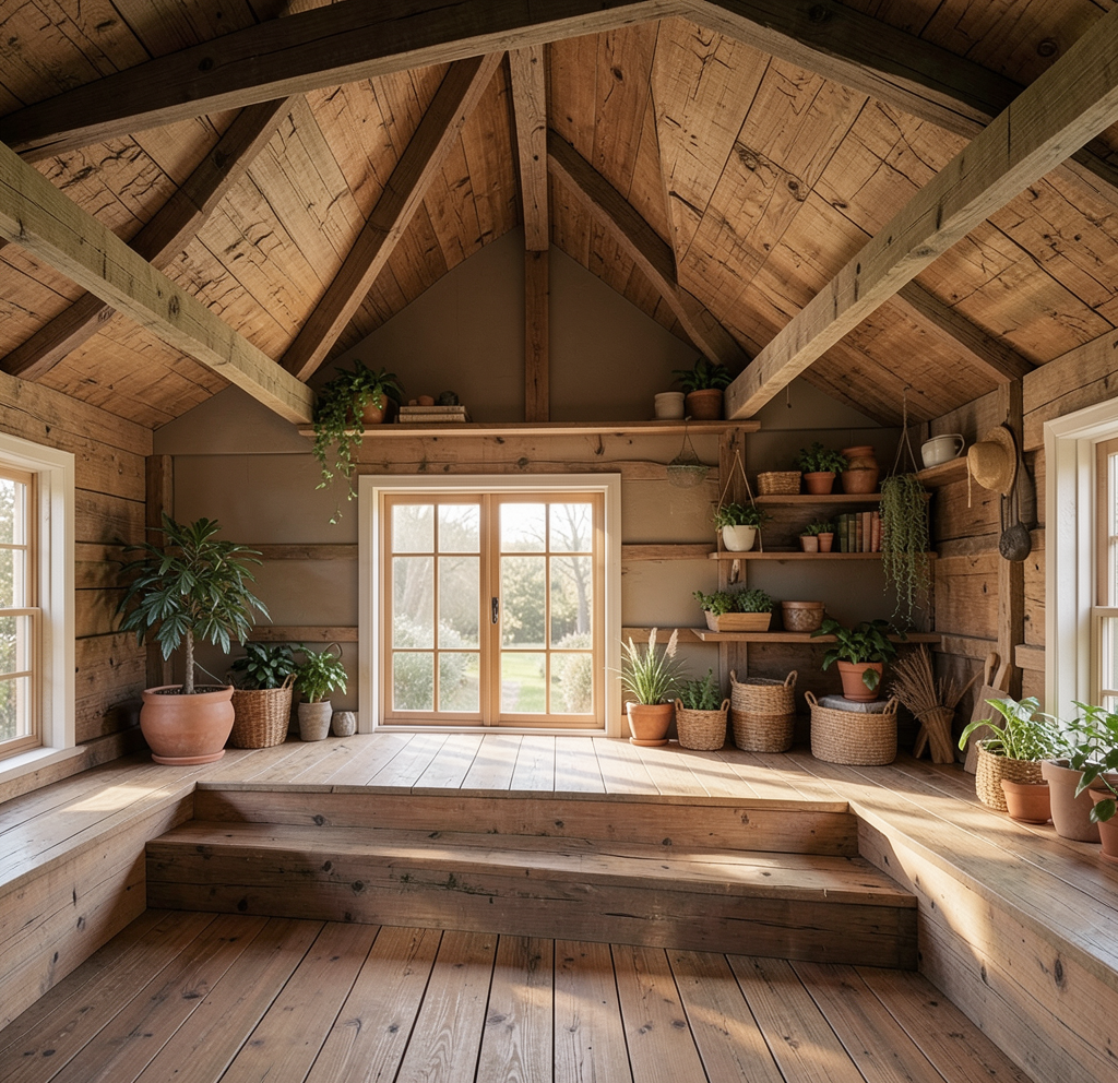 a modern rustic man cave games room the room contains a golf simulator with a hyper realistic putting green floor no additional lighting in the simulator area do not show a golf ball or hole black fabric walls and roof with the back having a high definition projector image of the game display the sectional sofa is ultra realistic comfy leather like vinyl with complimenting throw cushions and blanket decor a coffee table with a dark tinted glass top shuffleboard below the tv s nhl super chexx pro bubble hockey edmonton oilers black version including a black base and a oilers logo on the base 3 tv s on the feature tv wall the top tv is displaying a high definition blue jays baseball game the bottom tv is displaying a high definition edmonton oilers hockey game the large tv to the right is showing a high definition golf simulator game matching the projector image in the golf simulator all tv s are softly backlit around their perimeter the entire tv wall with 3 tv s is finished with horizontal medium large planks of rustic reclaimed wood do not backlight the rustic tv wall the bottom 42 of all exterior walls are finished in galvanized vertical corrugated metal capped at the top with a small wood sill that has led strip lighting underneath providing a soft lighting onto the corrugated metal no lighting at the bottom of the corrugated metal soft natural light coming through the windows and pot lights throughout providing gentle ambient soft mood lighting make all the wood for table coffee table chairs and corrugated steel trim a medium dark wood grained birch the floor should be a medium dark gray cut and polished concrete floor change nothing else add nothing else