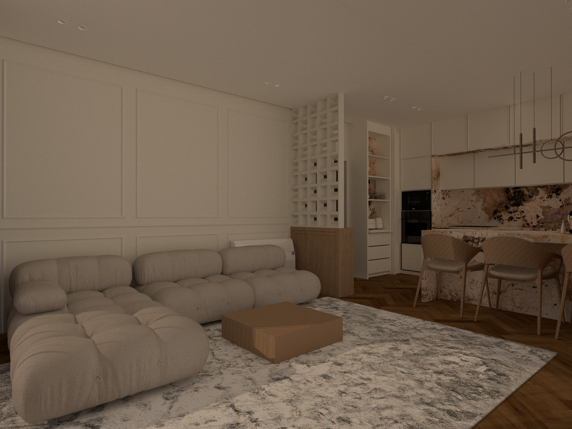 ultrarealistic render led at the kitchen white carpet with texture