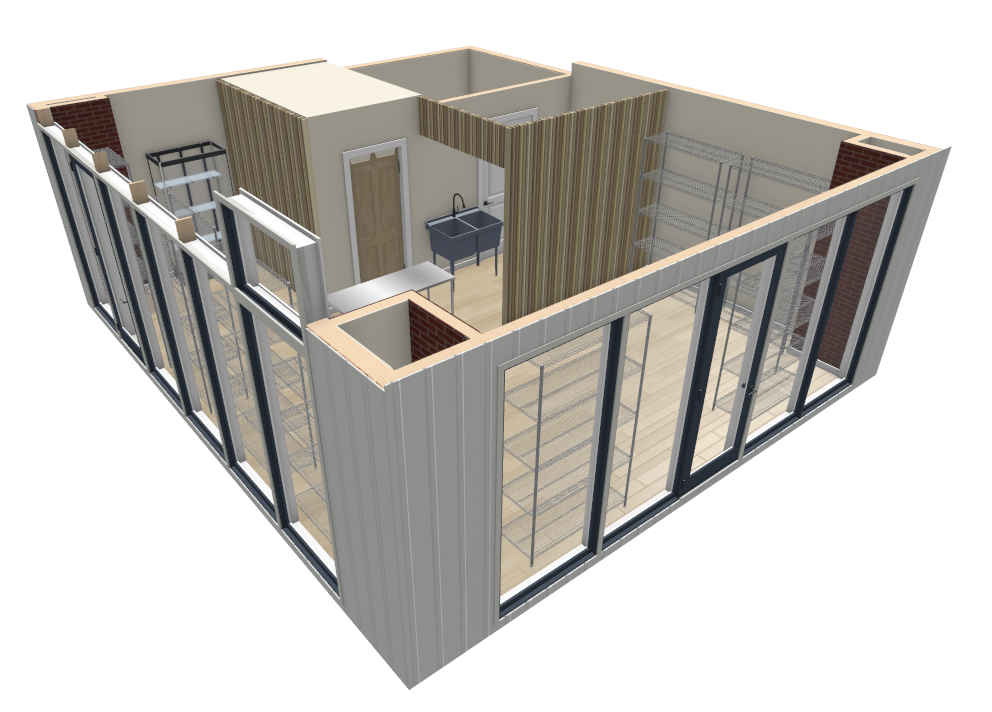 render a modern interior room featuring expansive glass walls use a soft warm beige for the walls to create a welcoming ambiance the exposed brick elements should be in deep red orange adding an industrial touch the glass frames should be sleek matte black for a contemporary look feature wooden floorboards in a light oak finish enhancing the natural feel the ceiling is a smooth matte cream add a textured wood paneled accent wall in earthy tones incorporate minimalist metal shelving in brushed silver illuminate with soft natural lighting for a serene and inviting atmosphere