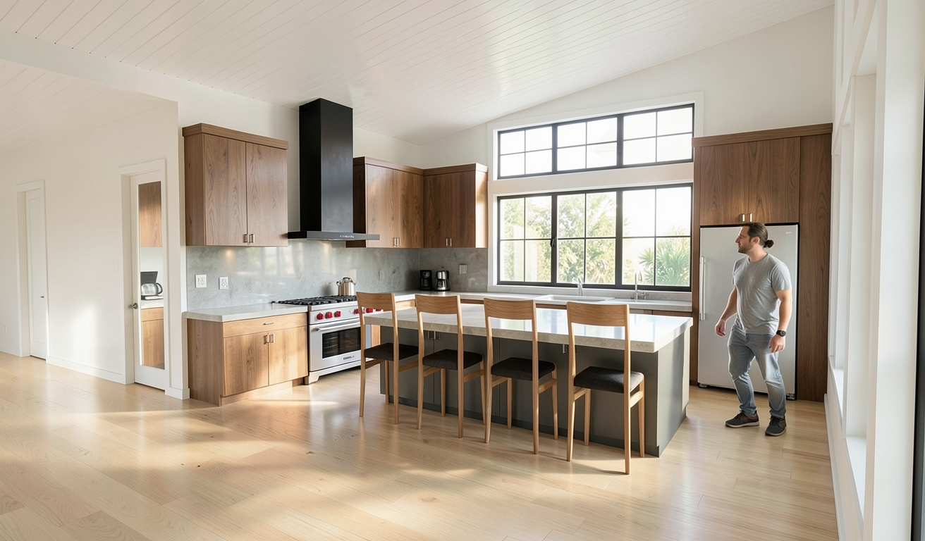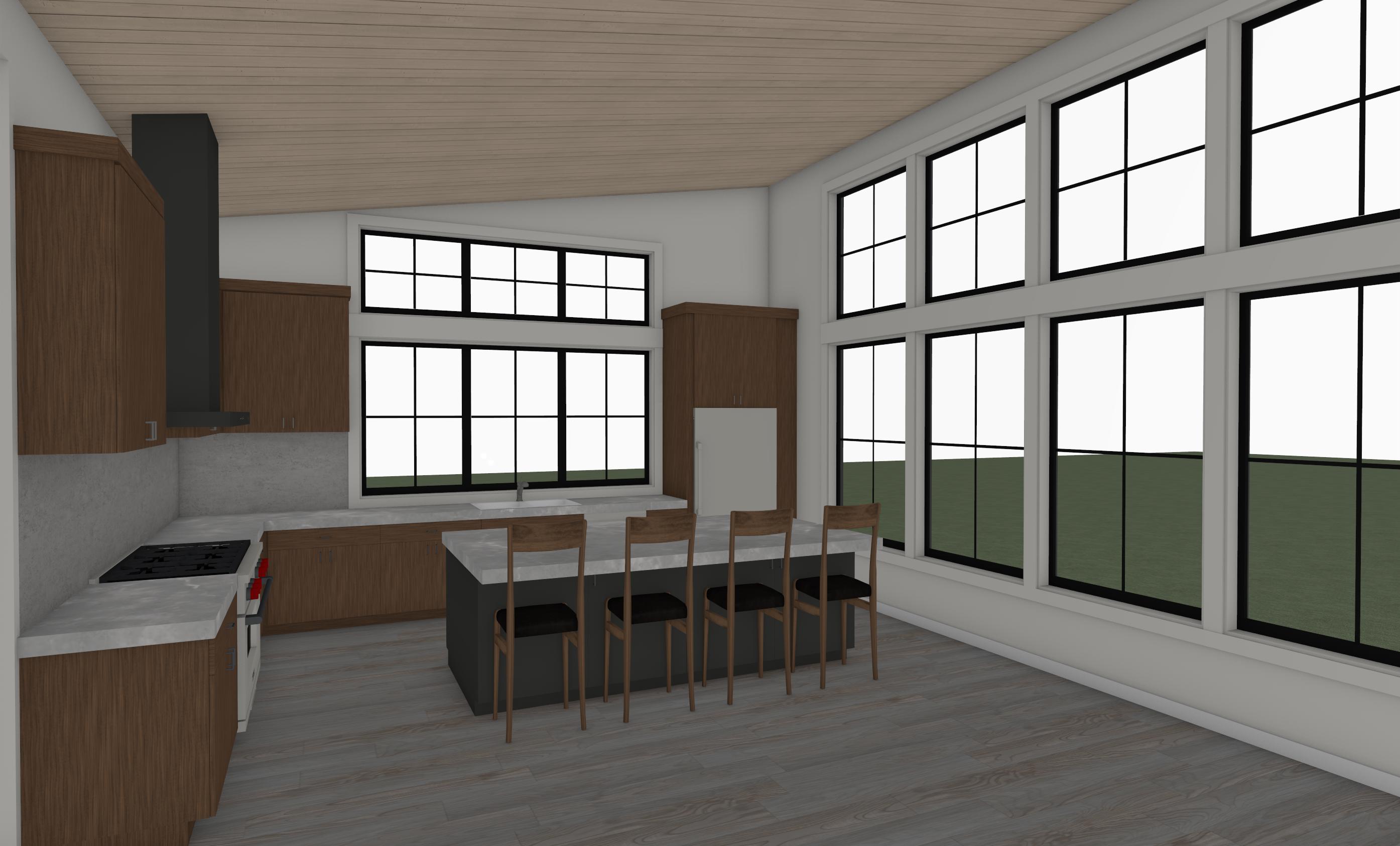 make realistic make counter top polished concrete make cabinets walnut make floor and ceiling white oak no knots on wood