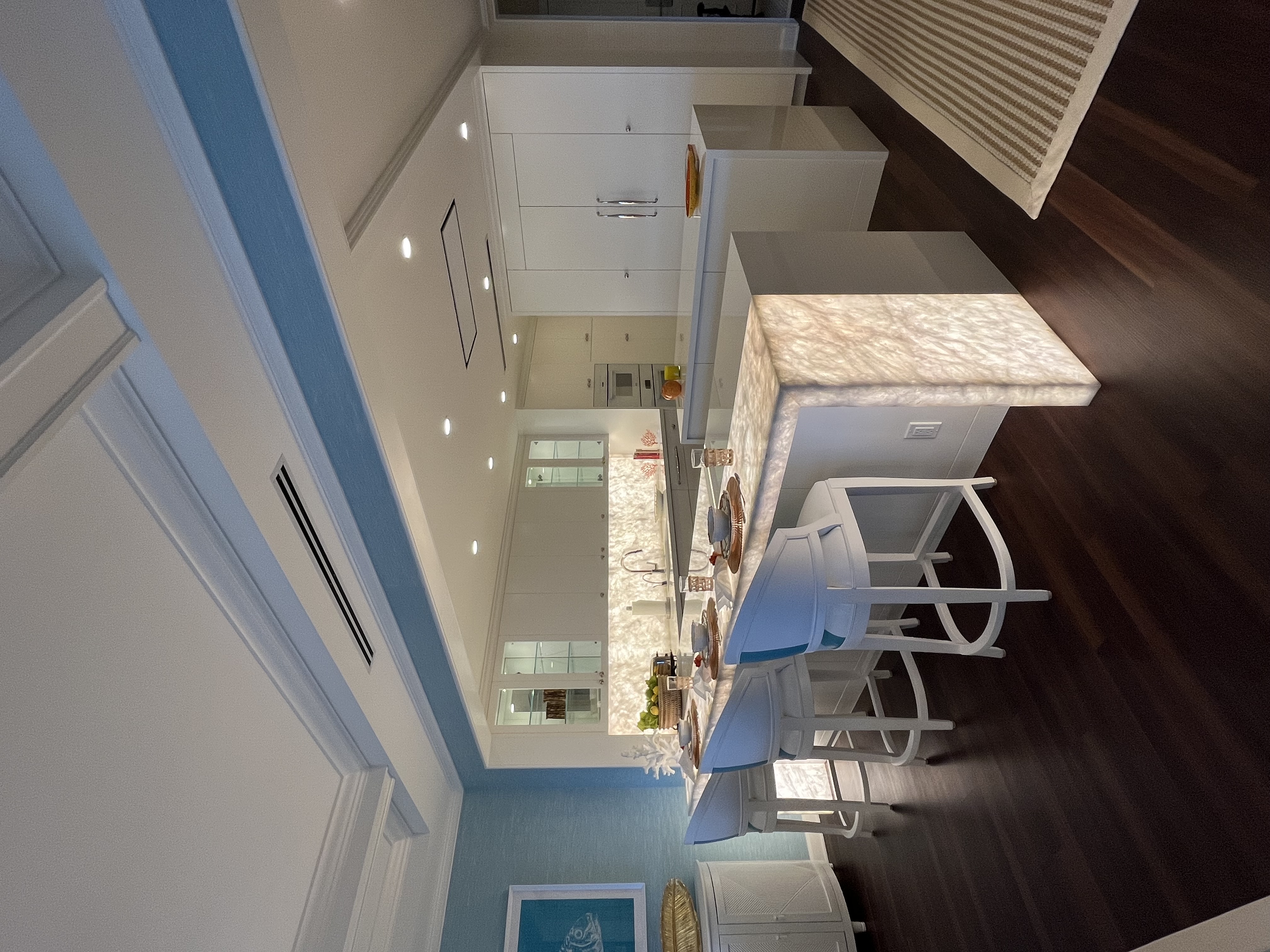 interior shot high gloss white lacquer cabinets with white polished counter tops contrasting cabinets at island