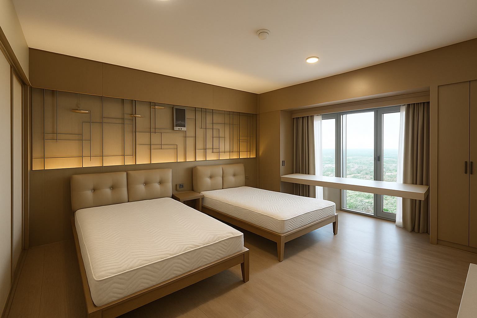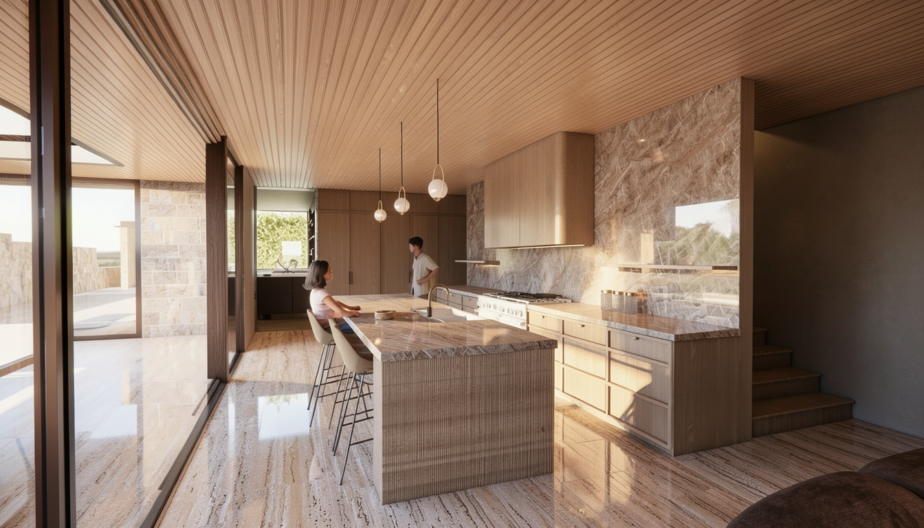 transform into a high end hyper realistic visualisation keep the view the same same walls same window floors are a honed travertine stone keep materials the same just enhance luxury modern kitchen
