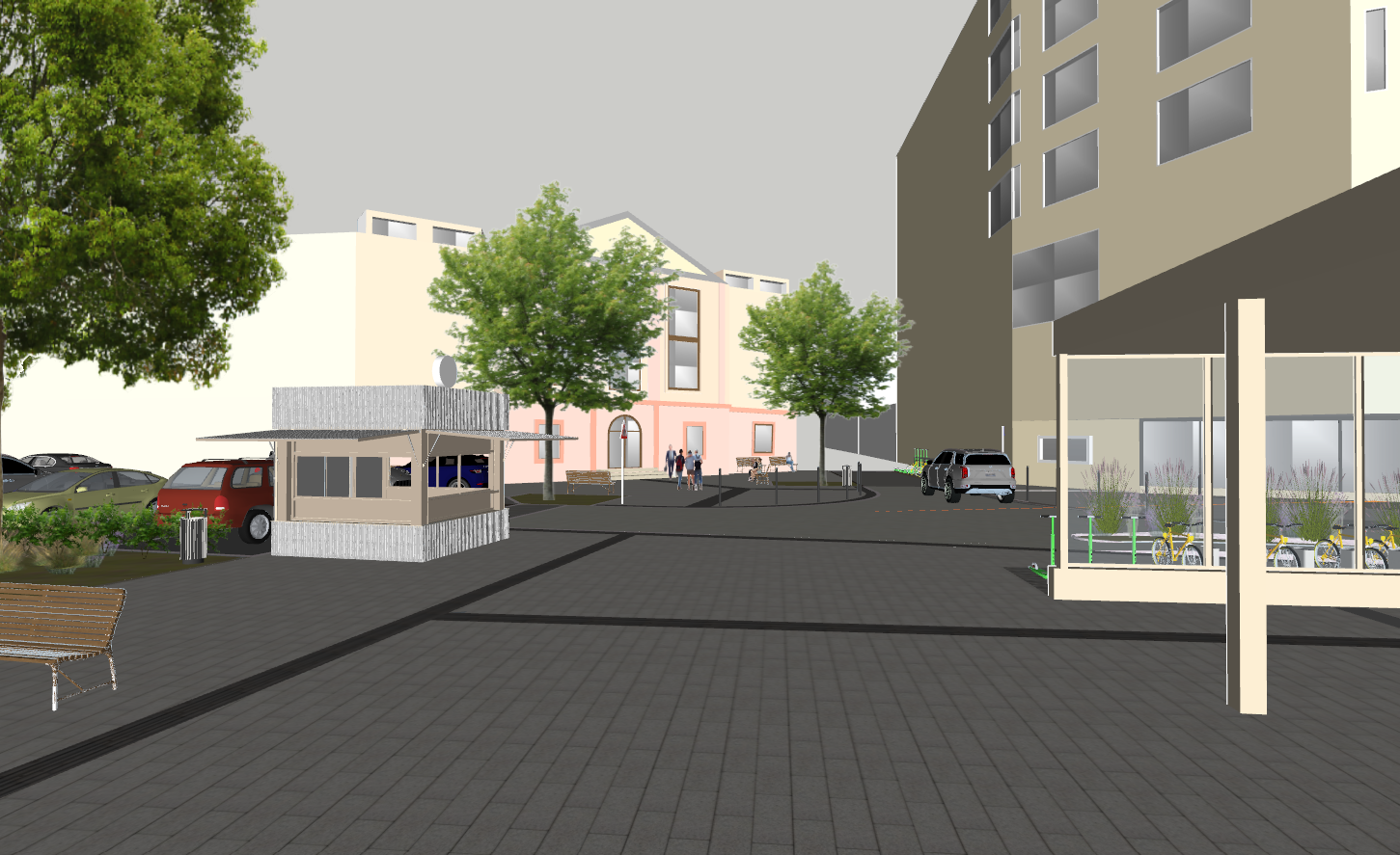 ultra realistic architectural visualization based strictly on the provided raw sketchup view preserve exact geometry proportions camera angle composition and architectural details do not redesign or alter the building enhance only with realism add realistic materials with physically accurate textures natural wood grain brushed concrete glass reflections subtle imperfections micro surface details use high dynamic range lighting with soft global illumination and realistic shadows create a lively atmosphere enhance environment with greenery slight wind in trees varied vegetation tones small urban details parked cars benches subtle signage add depth with atmospheric perspective and realistic sky conditions golden hour soft overcast choose whichever enhances the mood cinematic composition photorealistic rendering 8k detail realistic depth of field natural color grading slightly warm tones architectural photography style shot on full frame camera 35mm lens maintain realism over stylization avoid cartoonish or ai looking artifacts preserve the colour of the kiosk the material of the kiosk is plaster