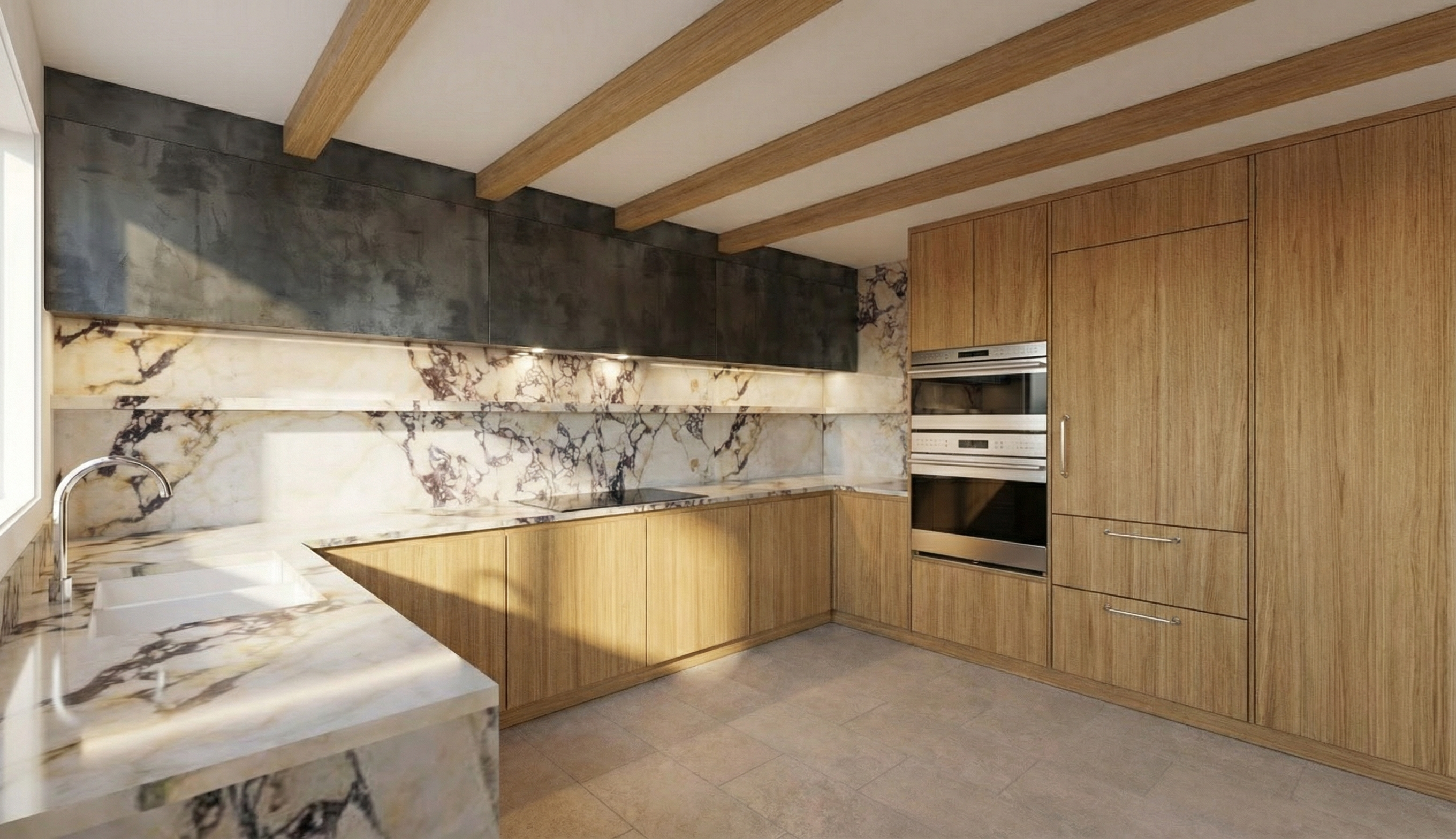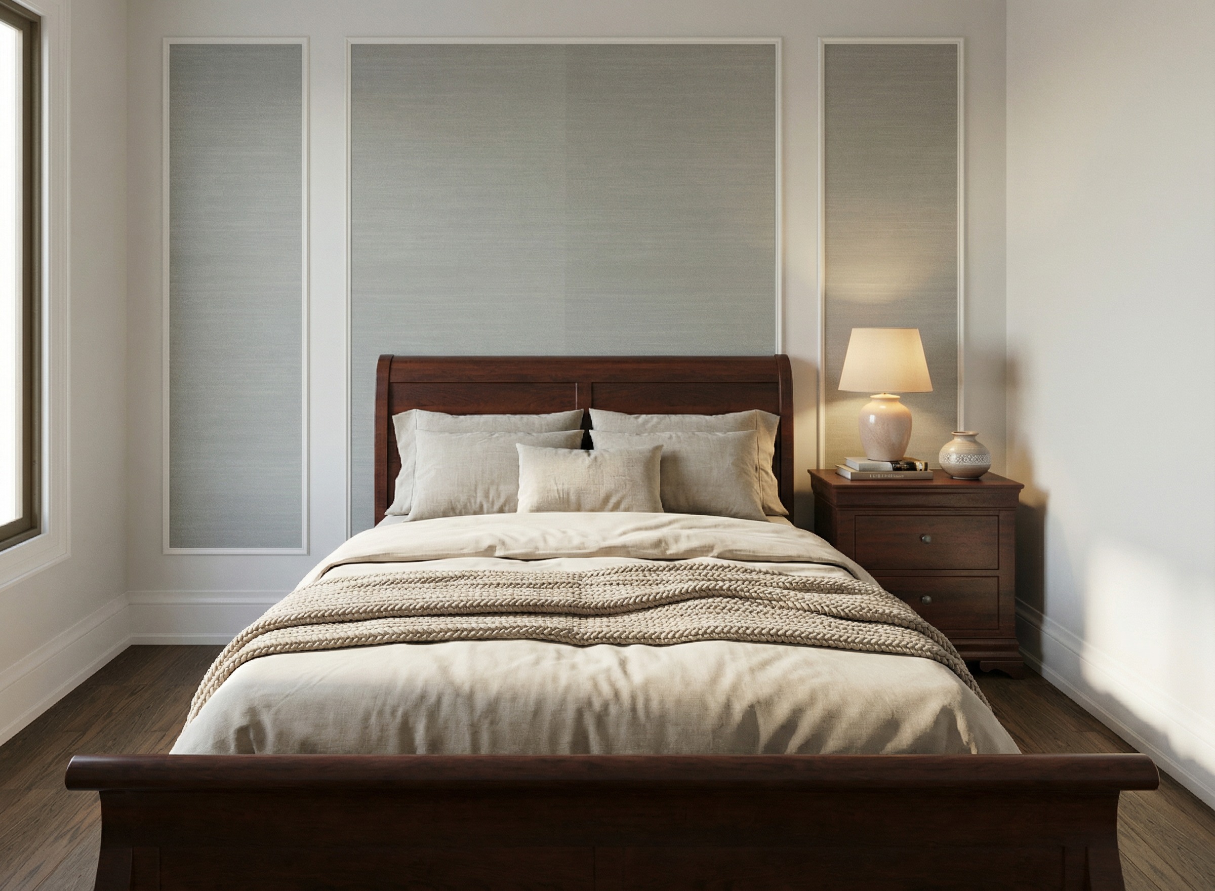 add beige curtains to window on the left side of image preserve colors