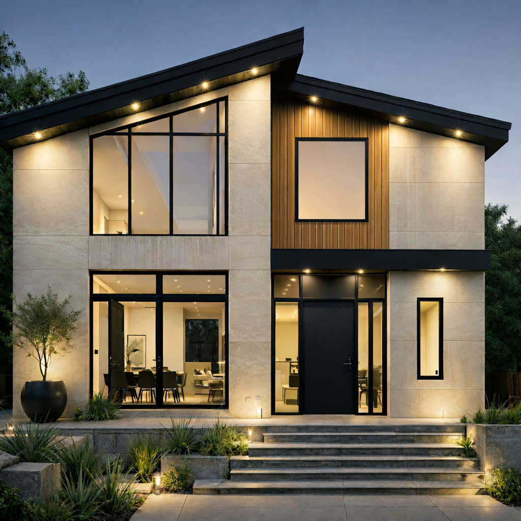 modern two story house exterior at twilight strictly preserve the exact architecture proportions windows and materials of the original design do not change any geometry or layout modify only the upper right facade second floor area previously finished in black metal siding replace this surface with vertical white oak wood louvers the louvers should be evenly spaced clean and minimal with a warm natural white oak tone light honey color subtle grain and matte finish slats should run vertically from top to bottom creating a refined high end architectural screen effect ensure the window within this area remains clean and centered with a simple black frame and no internal mullions the wood slats should wrap neatly around the window opening with precise detailing maintain all other materials unchanged large format light beige travertine stone black aluminum window frames black metal roof and warm recessed architectural lighting style modern european warm minimal luxury residential ultra realistic soft warm lighting high detail dont make any strctural changed only the material of that wood vertical in second floor