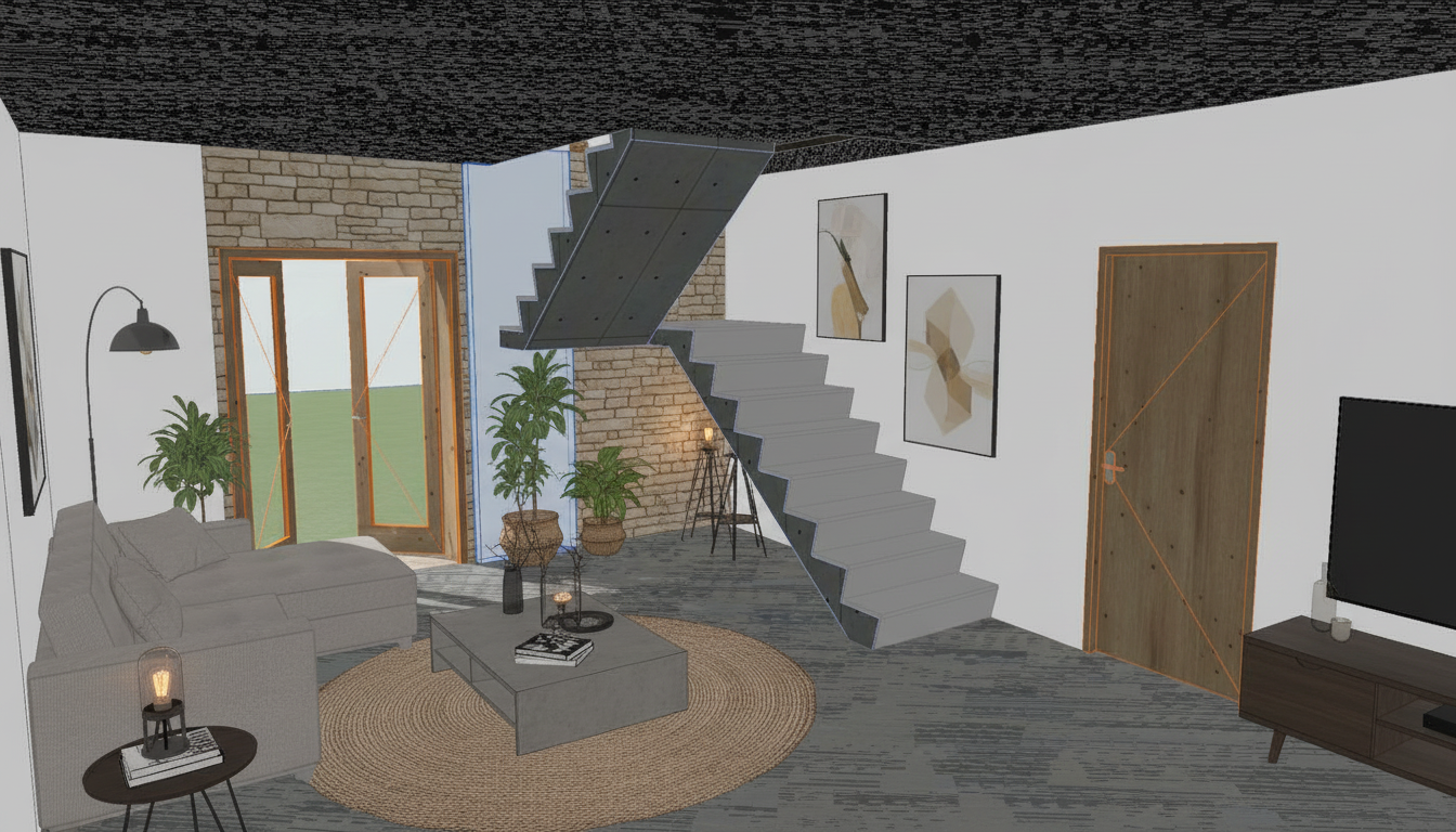 photorealistic interior render of a modern living room with a floating concrete staircase maintain exact geometry proportions and layout the staircase consists of thick cantilevered concrete steps with a minimal metal railing and open risers positioned diagonally along the wall under the stairs a custom built in tv unit with a continuous horizontal composition lower cabinets in matte white finish and a central wood panel warm oak tone integrating a wall mounted flat screen tv matching wood shelf above with recessed led spot lighting floor in light neutral tone soft woven rug in beige walls in warm white minimal decoration books ceramic vases and a green indoor plant under the stairs soft natural lighting from above diffuse shadows high realism style contemporary minimalist scandinavian influence clean lines warm materials high detail ultra realistic textures soft ambient light