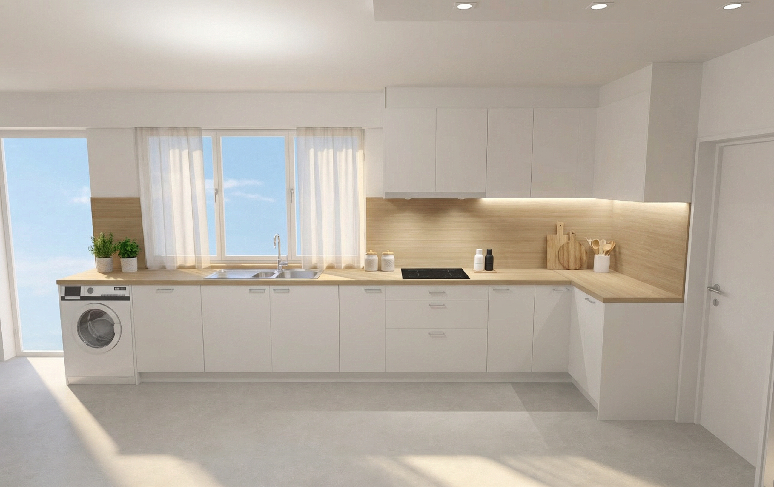 4k render warm lighting neff ovens the tap is black led lighting hidden under wall cabinets one strip only the worktop is calacatta white with not too much contrast kitchen units are blue navy but not dark improve the lighting 4k res