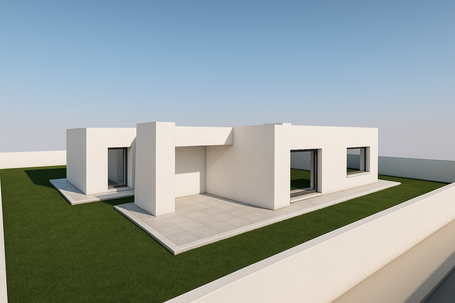 trasforma in stile fortemente mediterraneo con pareti bianche la sola struttura all ingresso rivestita come se fosse un muretto a secco pugliese arreda il giardino con piante basse ed arbusti mediterranei prato qualche masso e 3 o 4 alberi di ulivo dammi il risultato in 4k