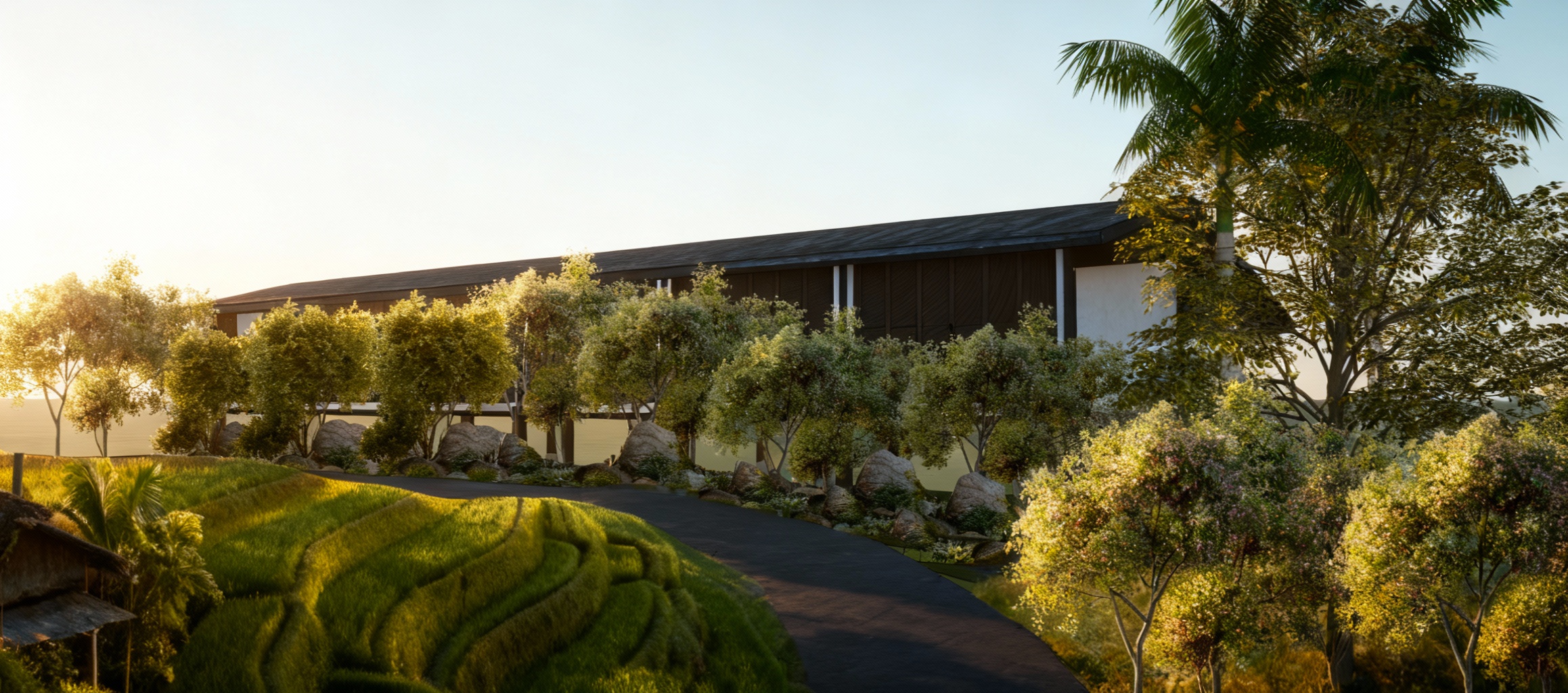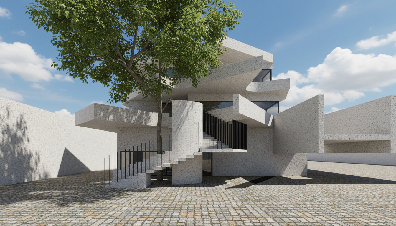 add light raw concrete texture on building add small cobblestone texture on the ground add leaves on the tree keep it small and make it realistic add sky in the background the structure on the right is a pool of water with a glass at the end