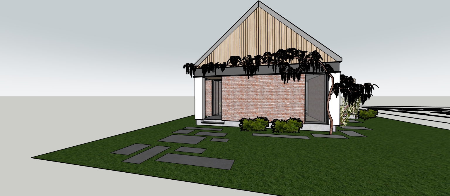 render a photorealistic 3d perspective of this house make a lush vegetation that looks native to the european area bushes and large trees nat cactus or suculents plant do not change the view only enhance the materials vibrant clear sky with light atmospheric depth keep materials as are in the picture but detail and make much better the texture groundfloor walls white plaster old brick first floor triangle wall made by wood lamel a separation between groundfloor and firstfloor metallic beam dark gray roof seam metal roofing window reflecting sourranded area alley to the house cement rectangle terrace cement platform make the brick look old