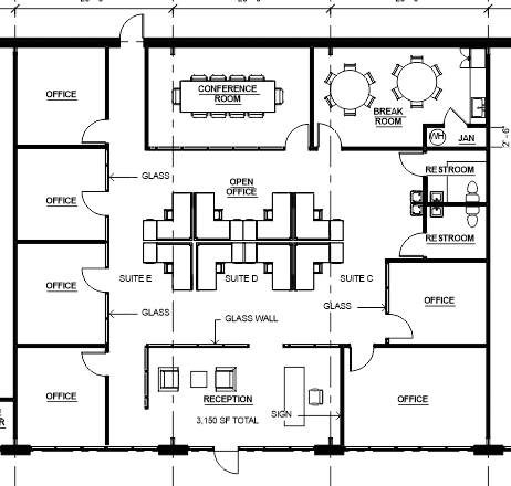 convert this floor plan into a realistic isometric 3d view of a full house show the space from an elevated angle with furniture walls and details visible modern office in retail center storefront glazing use the same furniture as shows on the plan do not change the orientation of the floorplan