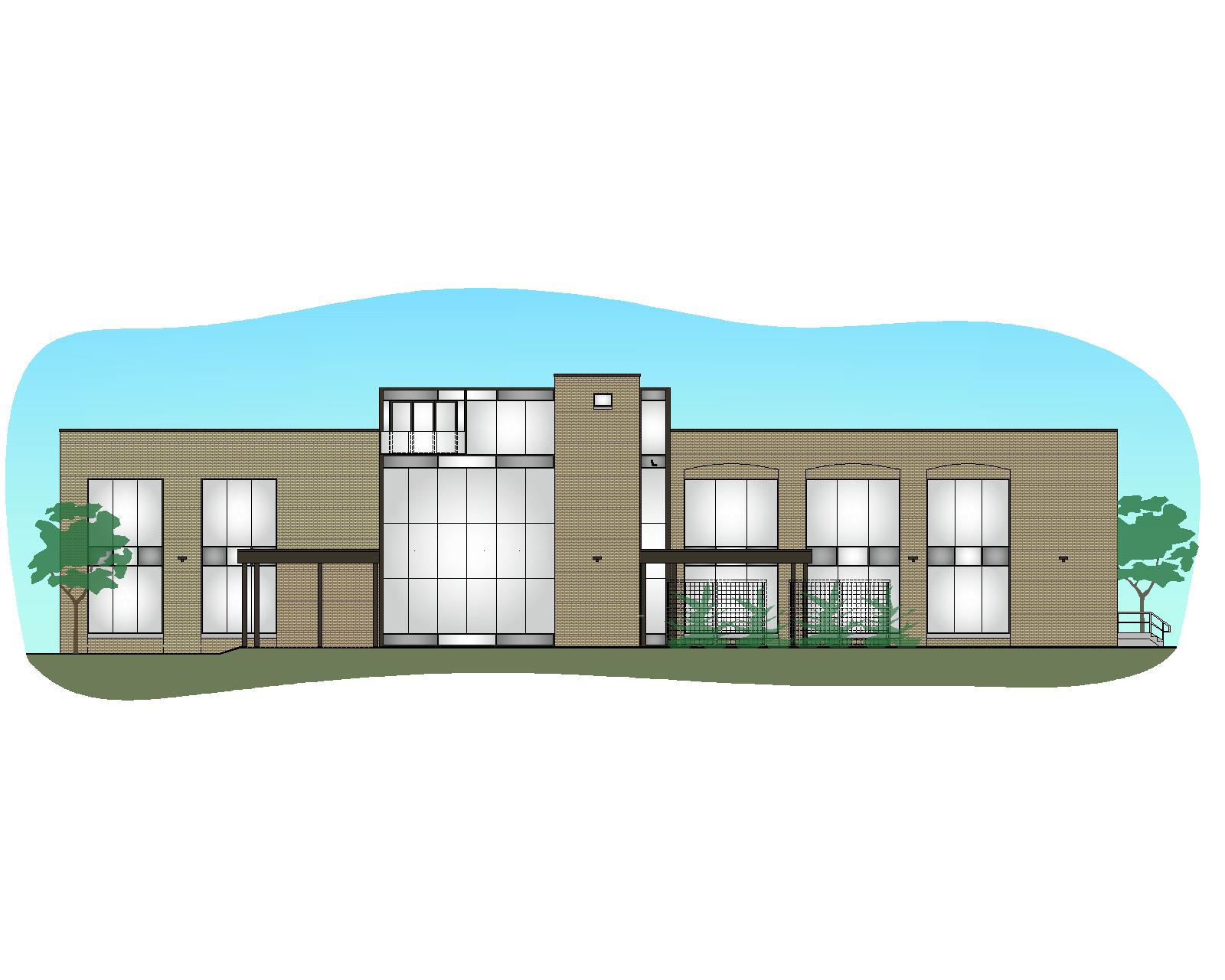 create a photorealistic rendering of this industrial building turned modern office building complete with landscaping and a bright mid day sky with clouds add a couple people for a human touch a nicely landscaped parking area is in the foreground this building faces north be sure not to make the building look narrow it is 157 feet overall