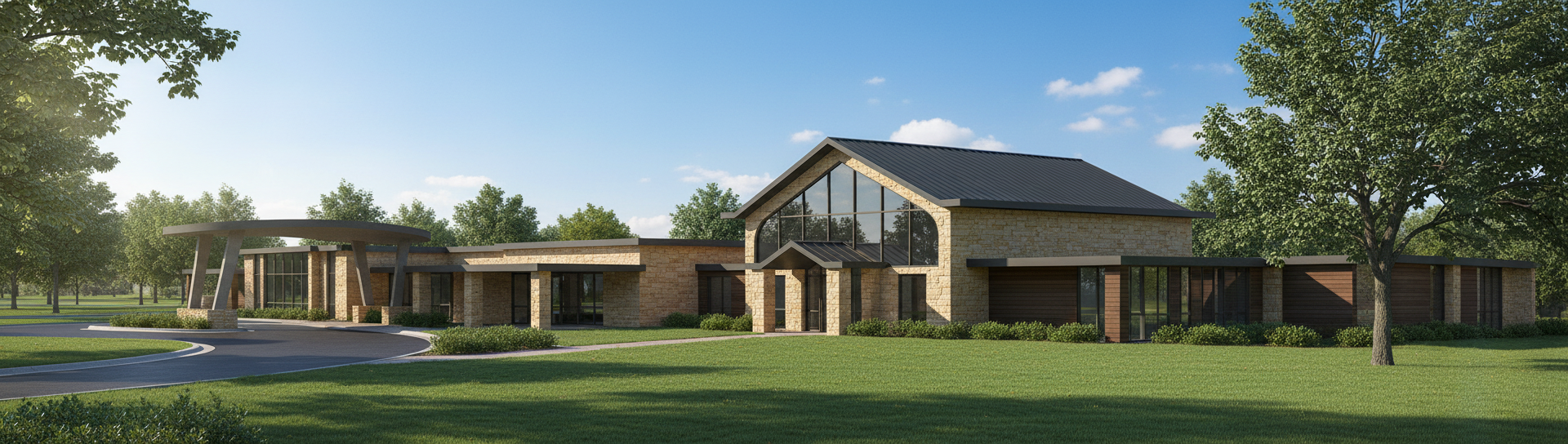 mid century modern architecture with strong influences of googie futurist design and some ecclesiastical modern traits add a driveway under front and right porch make clean cut landscaping common to kansas modern traits limestone