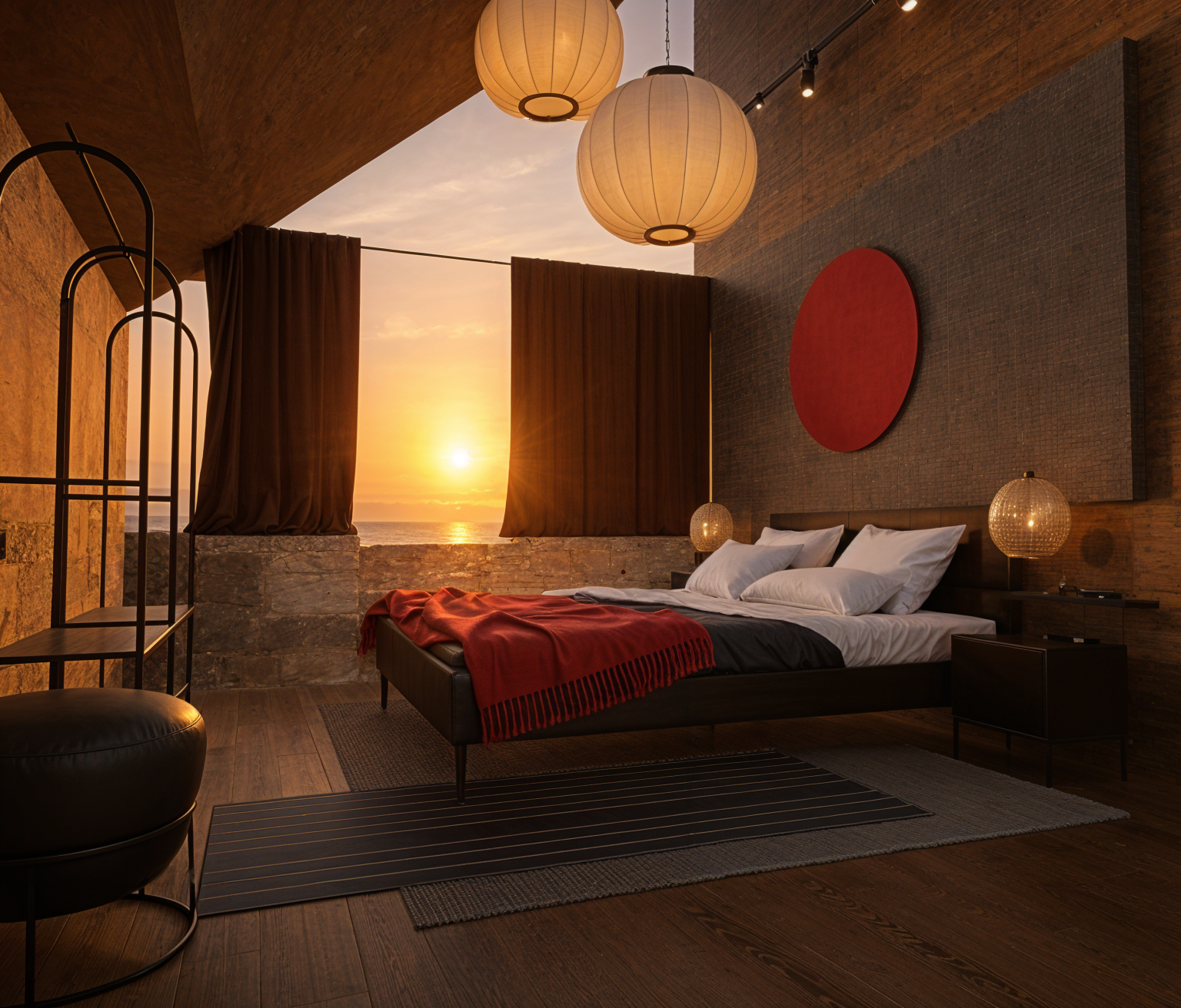 exterior shot farm house with black metal porch roof and cedar posts and black shingles black windows off white board and batt siding mature landscape and bright sunny sky with puffy clouds architecture