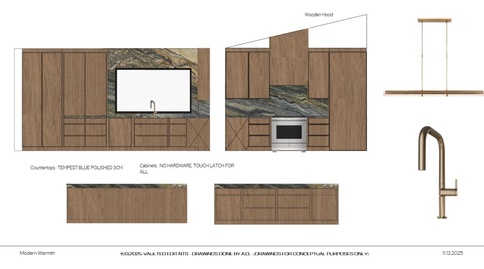 make this an angled view of a kitchen seeing both the range wall and sink wall the window behind the sink should have a backyard view with mountains in the distance the island has curved sides the floor is wood and the cabinets in the corner connect there is not a wall between them please match the countertop and backsplash material to the image