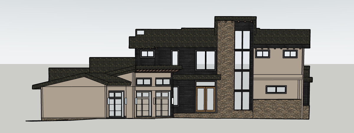 a manicured lawn layered flower beds low maintenance shrubs native plants stone pathway leading to the entrance with mountains in the distance