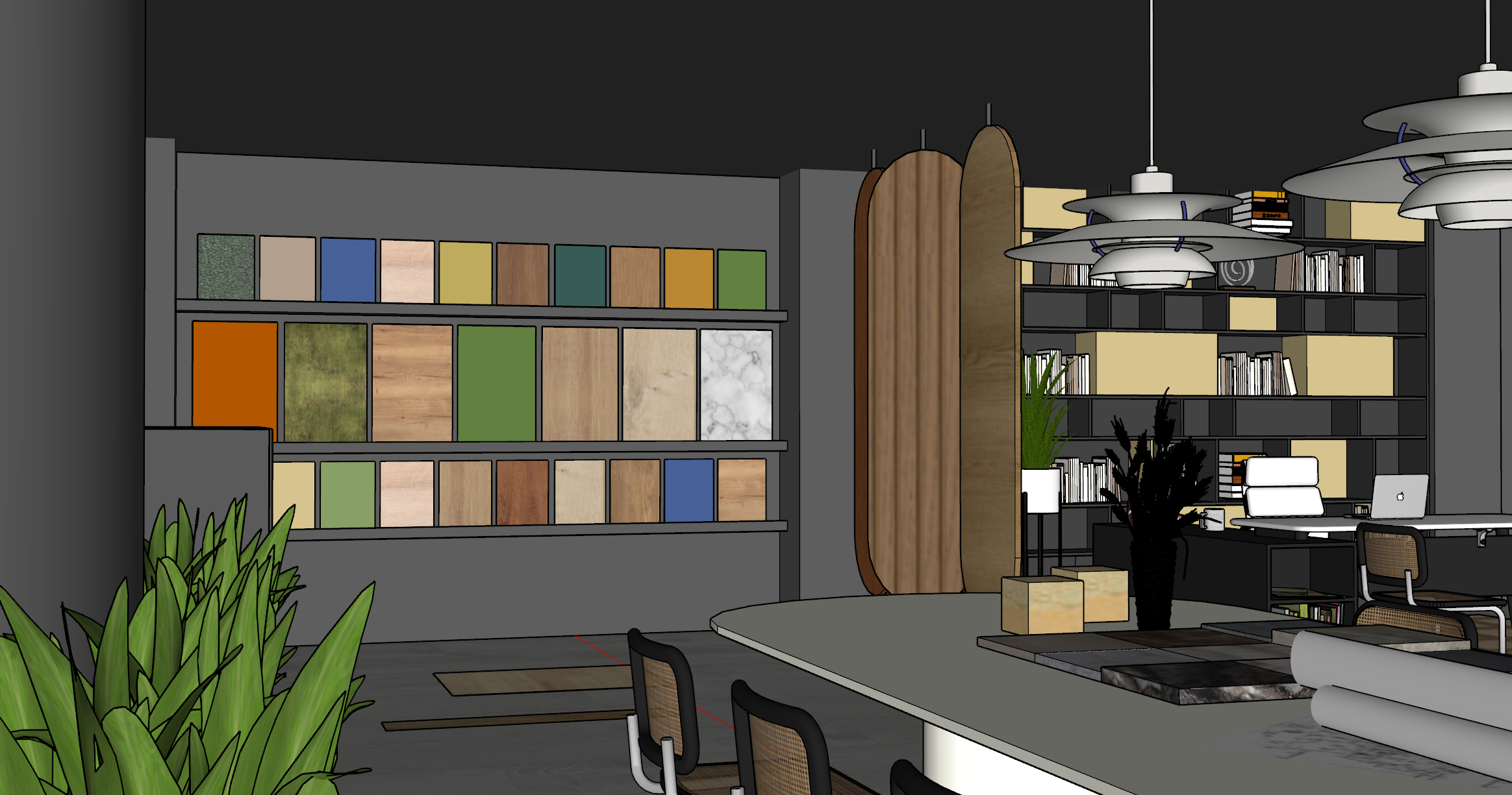 photorelistic render do not change colors and materials add rail black lighting on the ceiling