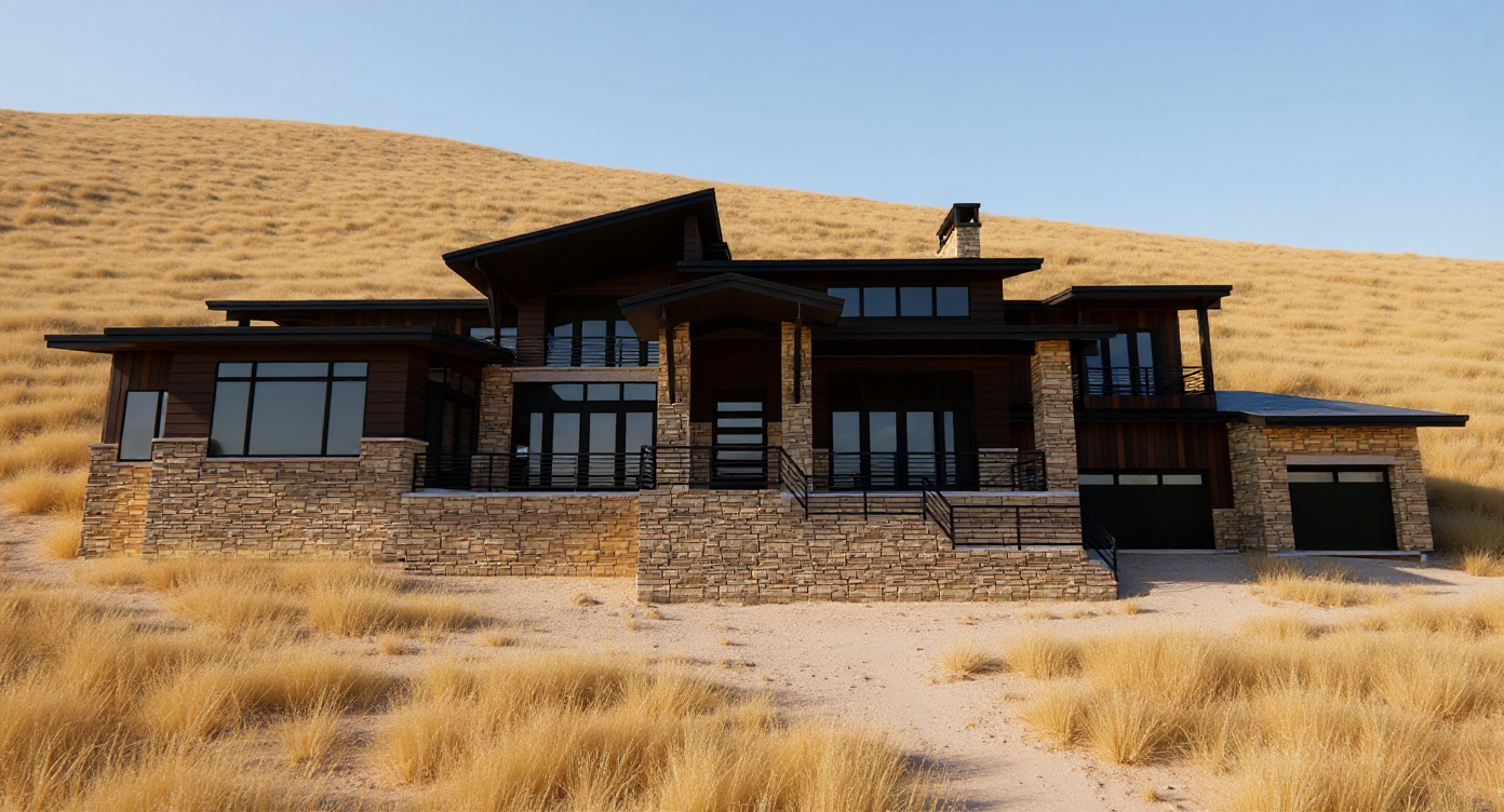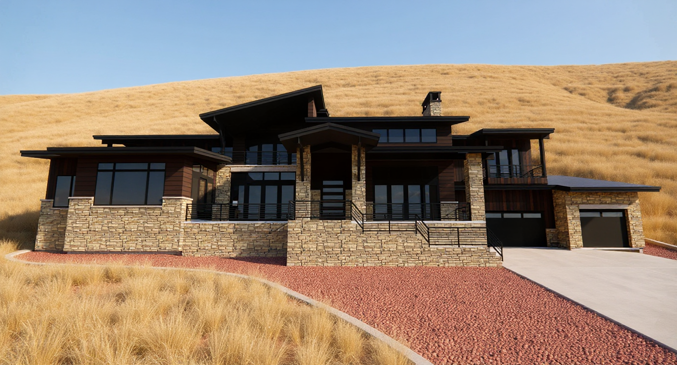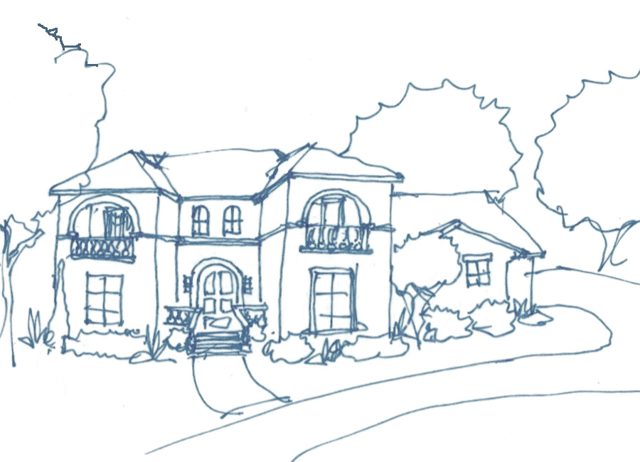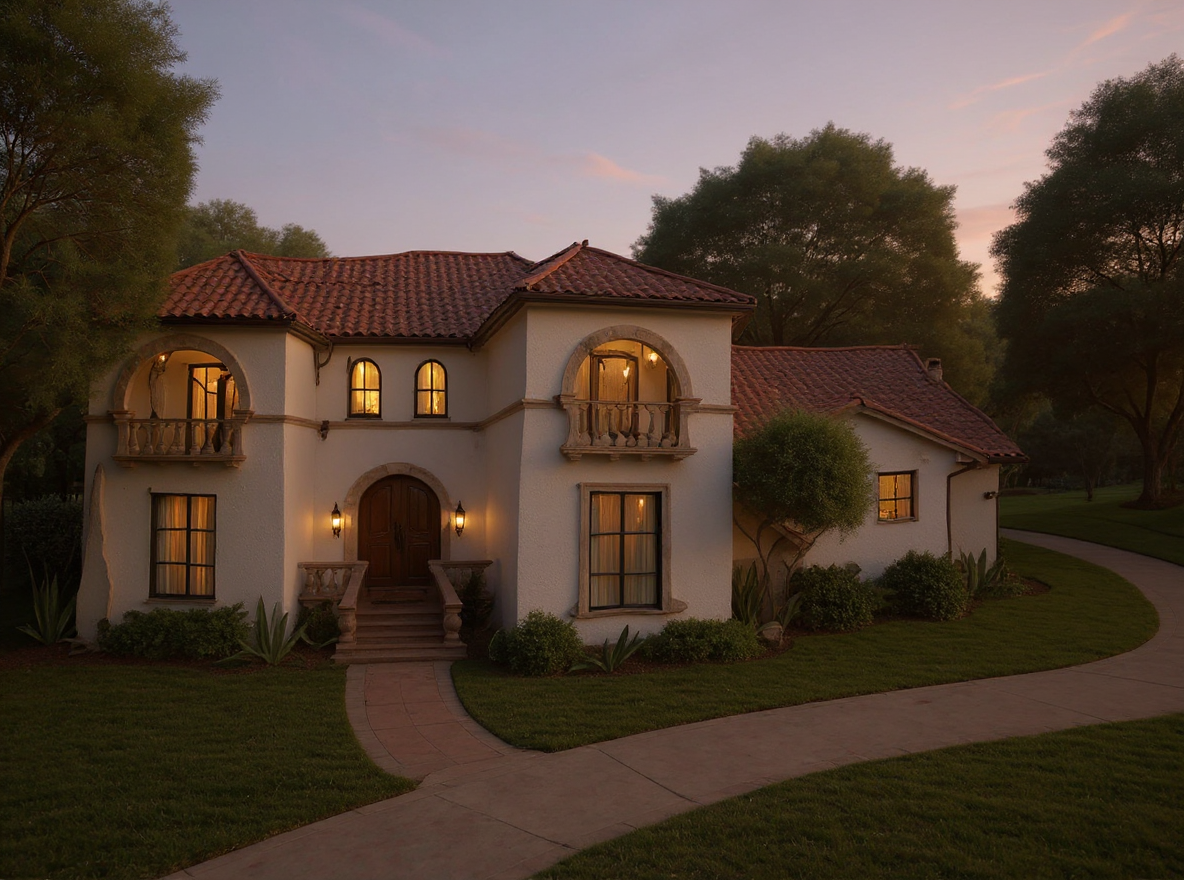 white stucco house with flat brown shingles light grey cast stone ballasters at porch and balconies black window frames wooden front door draw with lights on time of day sun set